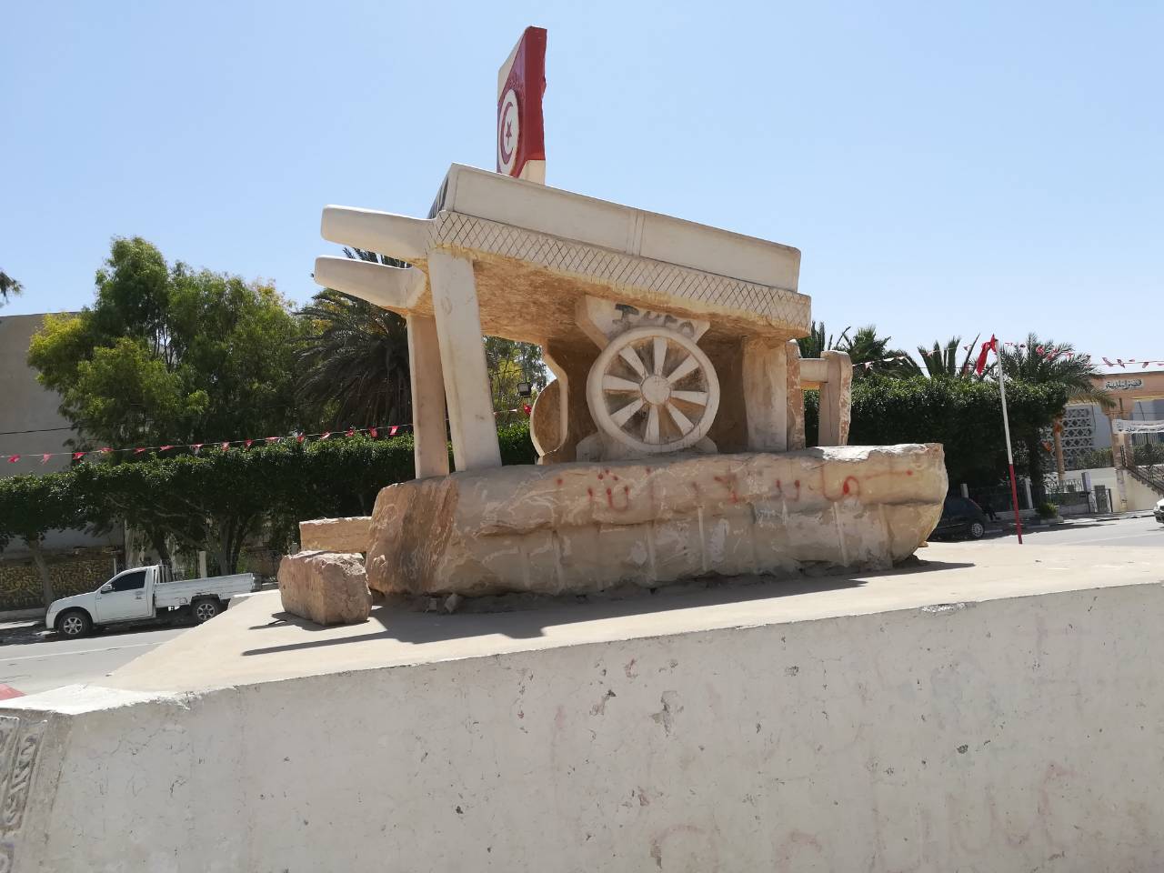 Das Denkmal in Sidi Bouzid zeigt den Verkaufswagen von Mohamed Bouazizi, der mit seinem Tod die tunesische Revolution auslöste. Nachdem sein Wagen konfisziert worden war, protestierte der 26 jährige Straßenverkäufer mit seiner Selbstverbrennung gegen Behördenwillkür.