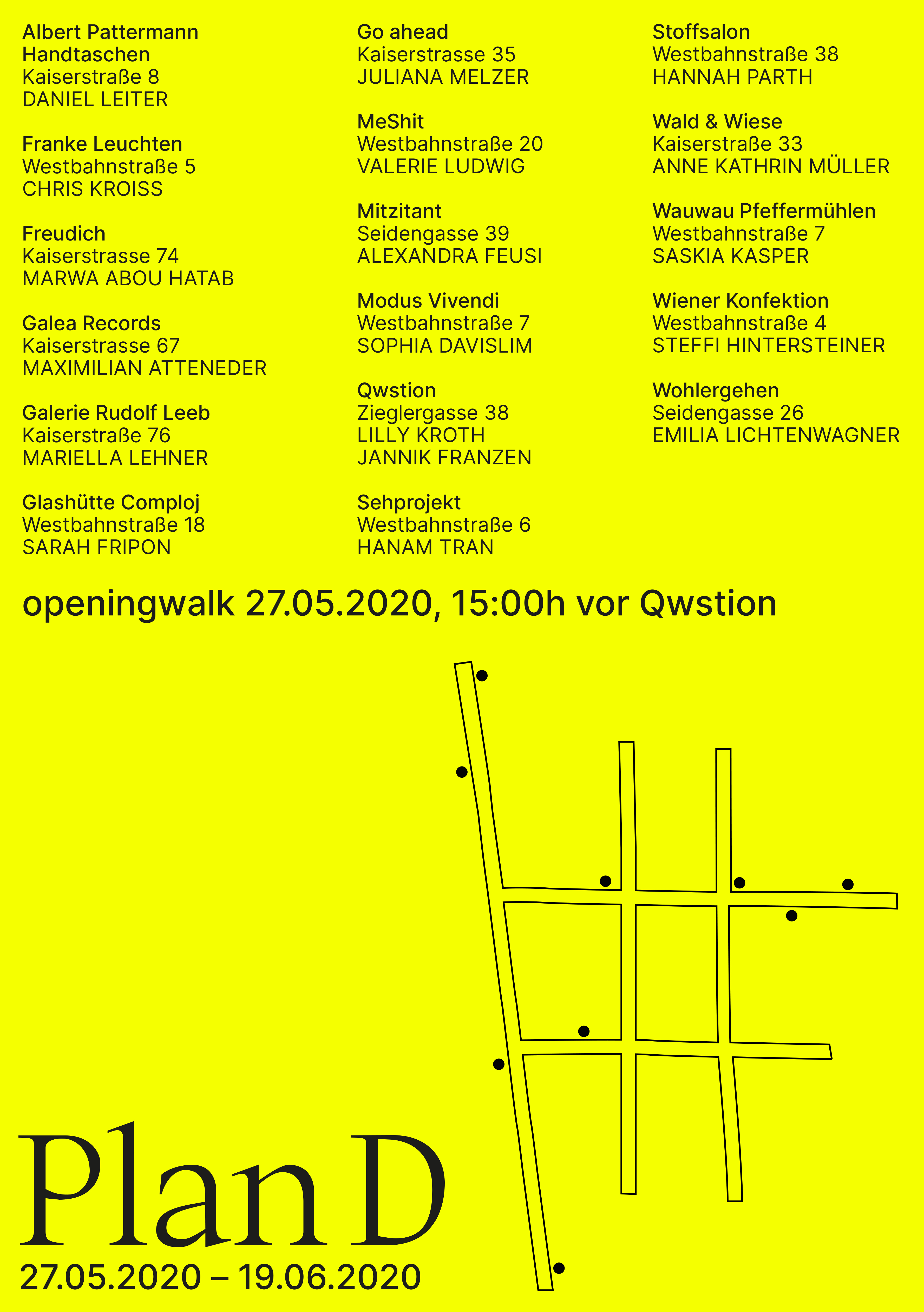 Plan D ist eine Kooperation von Gewerbetreibenden der Westbahnstrasse/Kaiserstrasse/Seidengasse und Studierenden der Akademie der bildenden Künste Wien, Fachbereich Zeichnen. Aufgrund der Absage von Ausstellungsprojekten durch die Coronakrise suchten Künstler*innen nach neuen Möglichkeiten der Kommunikation, des Ausstellens und des Dialogs abseits digitaler Räume. Dank unkomplizierten Handelns einiger Geschäftsleute entstand die Zusammenarbeit durch eine Ausstellung über mehrere Straßen.