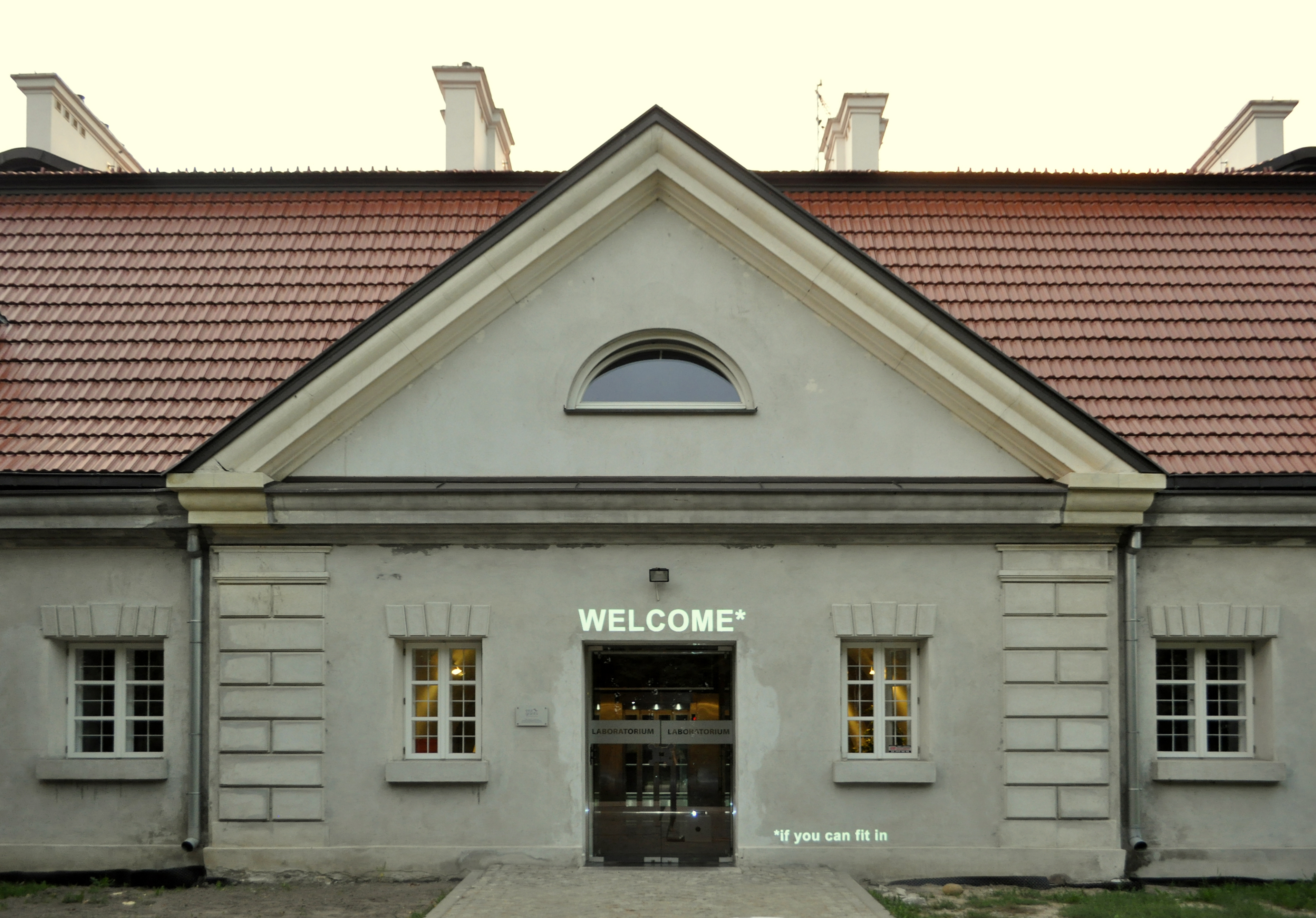 »Welcome*« *(if you can fit in) . Site specific project, Projection on the front wall of Laboratory building of the Center for Contemporary Art, Zamek Ujazdowsky, Warsaw, Poland, 2012, photo © L. Nakonechna