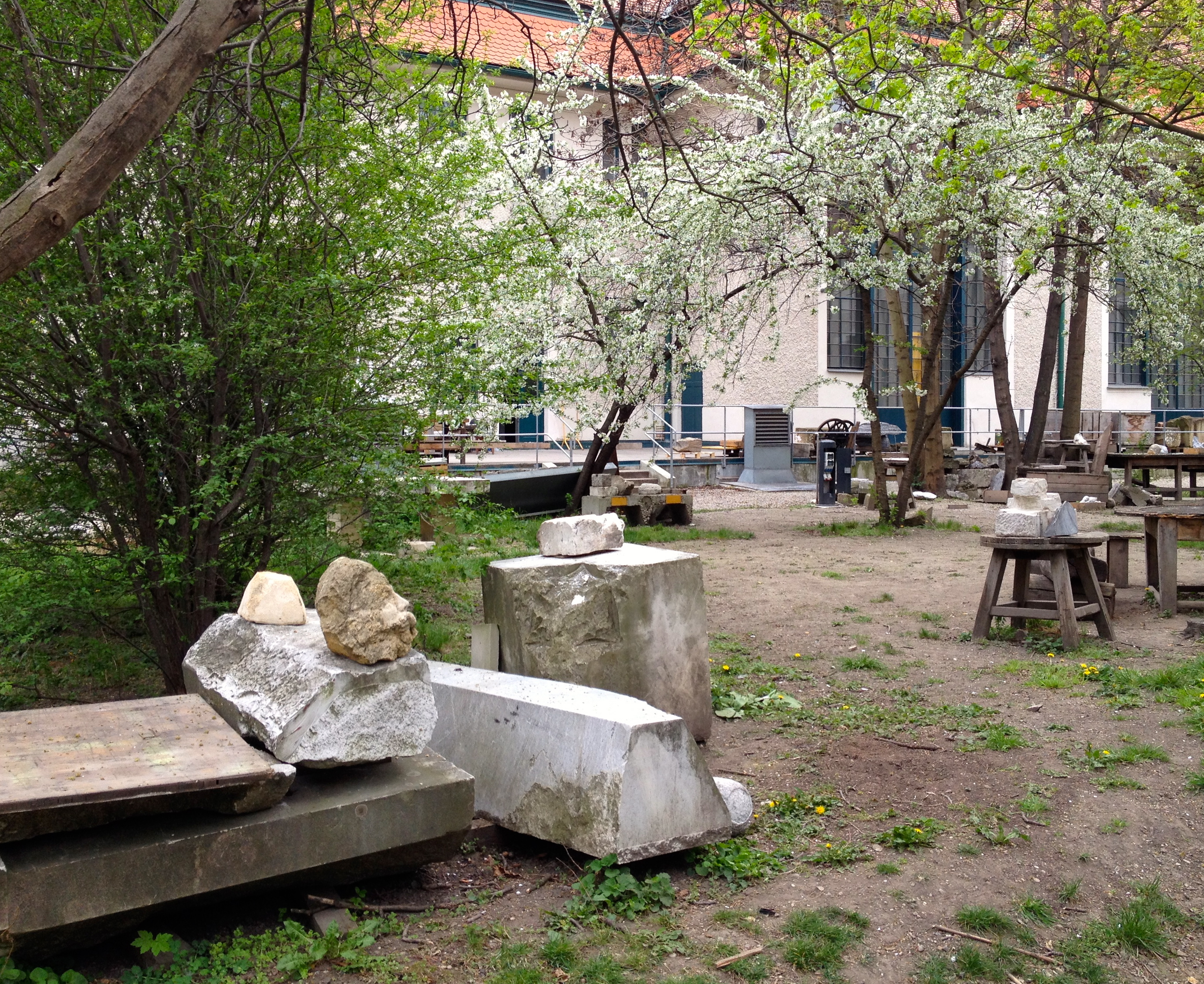 Die Steinwerkstatt existiert temporär im Garten der Bildhauerei zu Zeiten der Lehrveranstaltung Technische Grundlagen der Bildhauerei - Stein jeweils im Sommersemester.