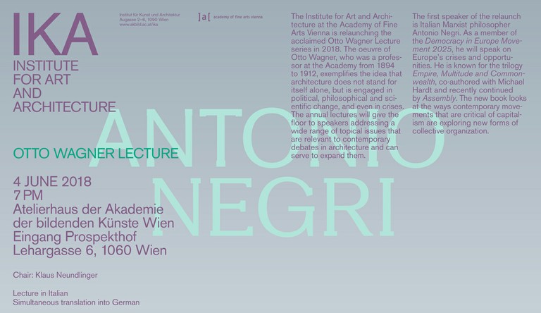 2018 nimmt das Institut für Kunst und Architektur an der Akademie der bildenden Künste Wien die renommierte Otto-Wagner-Lecture wieder auf. Zu Gast ist als erster Redner der italienische Philosoph und Marxist Antonio Negri (1933). Als Protagonist der italienischen Potere Operaio und später, in der intensiven Auseinandersetzung mit dem französischen Poststrukturalismus besonders Michel Foucault, Gilles Deleuze und Felix Guattari, bedeutender Vertreter des Postoperaismus sowie Mitglied der Bewegung Demokratie in Europa 2025 wird er über Europas Krisen und Möglichkeiten sprechen. Antonio Negri lehrte an der Universität Padua, sowie an der Universität Paris VIII und an der Ecole Normale Supérieure. Bekannt ist er für seine zusammen mit Michael Hardt verfasste Trilogie Empire , Multitude und Commonwealth , die aktuell durch Assembly. Die neue demokratische Ordnung fortgesetzt wird. Das Buch stellt die Frage, wie heute kapitalismuskritische Ansätze neue Formen der Kollektivität ausprobieren.