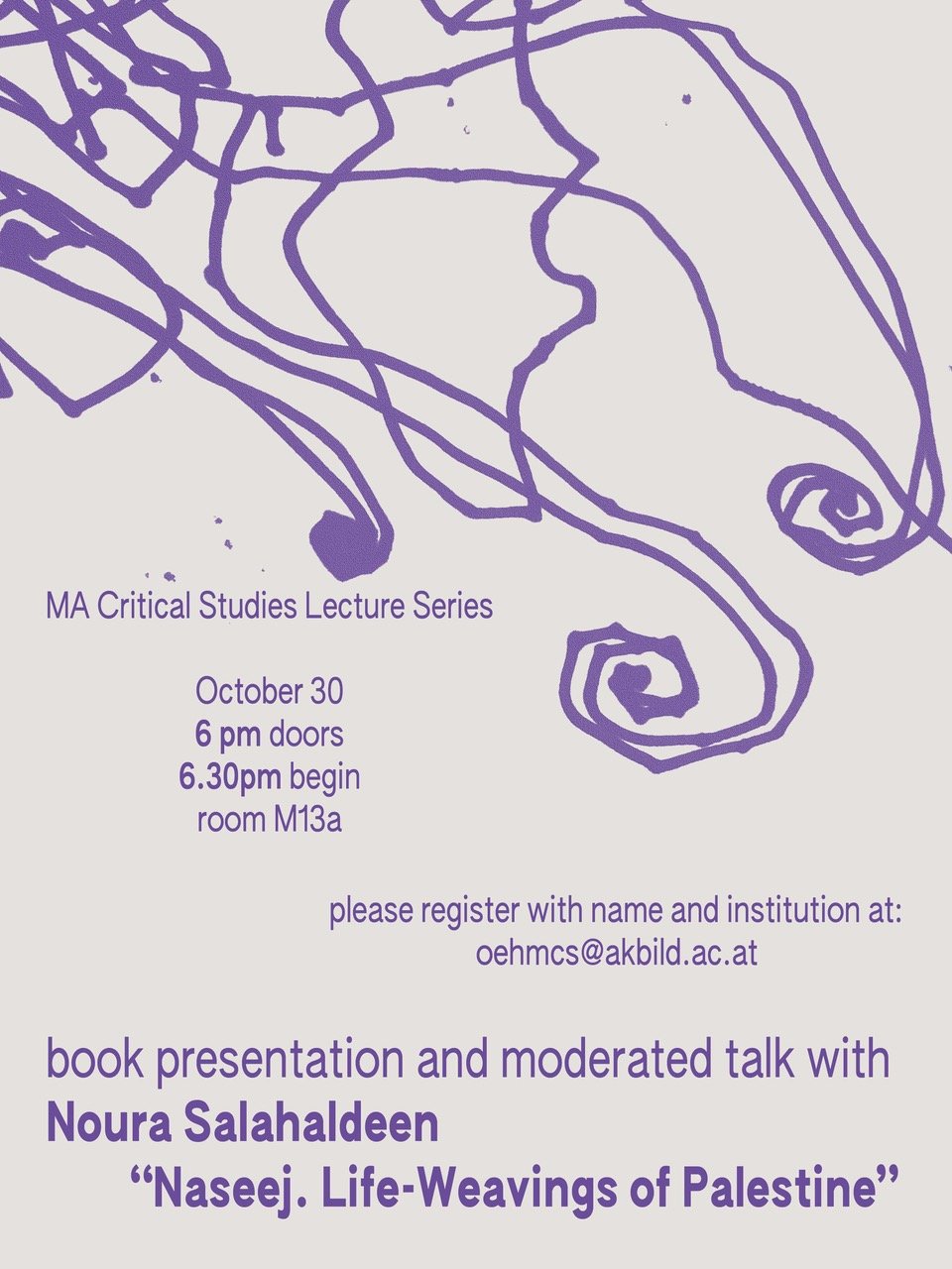 Studierende des Masterstudiengangs Critical Studies und alle Interessierten sind herzlich zu einer moderierten Diskussion über Noura Salahaldeens Projekt eingeladen. Im Rahmen der Veranstaltung wird das Buch vorgestellt, seine Ziele und Herausforderungen erläutert, und anschließend eine Diskussion über palästinensische Literatur und Geschichte geführt. Interessierte Personen werden gebeten, sich mit Namen und Institution über oehmcs@akbild.ac.at für die Veranstaltung zu registrieren. Das Gespräch findet auf Englisch statt.