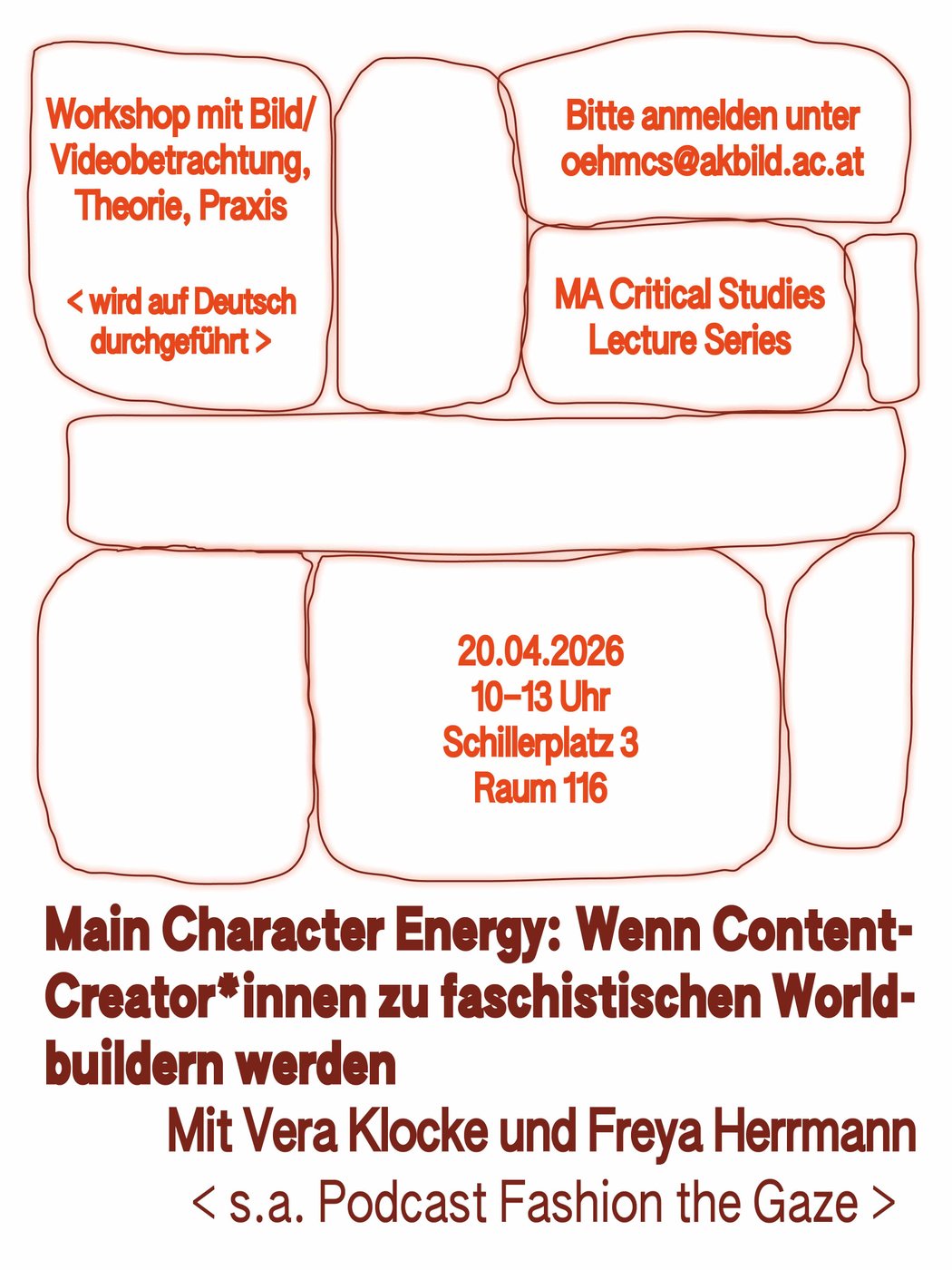 Auf TikTok und Instagram inszenieren sich Millionen als Protagonist_innen kohärenter Welten – ästhetisiert und algorithmisch optimiert. Im Workshop mit Vera Klocke und Freya Herrmann vom Podcast “Fashion the Gaze” analysieren Teilnehmende, wie Main Character Energy und obsessive Kurator_innenschaft in technofeudalistische Plattformökonomien eingebettet sind und welche Affinitäten zu faschistischen Ästhetischen entstehen können.