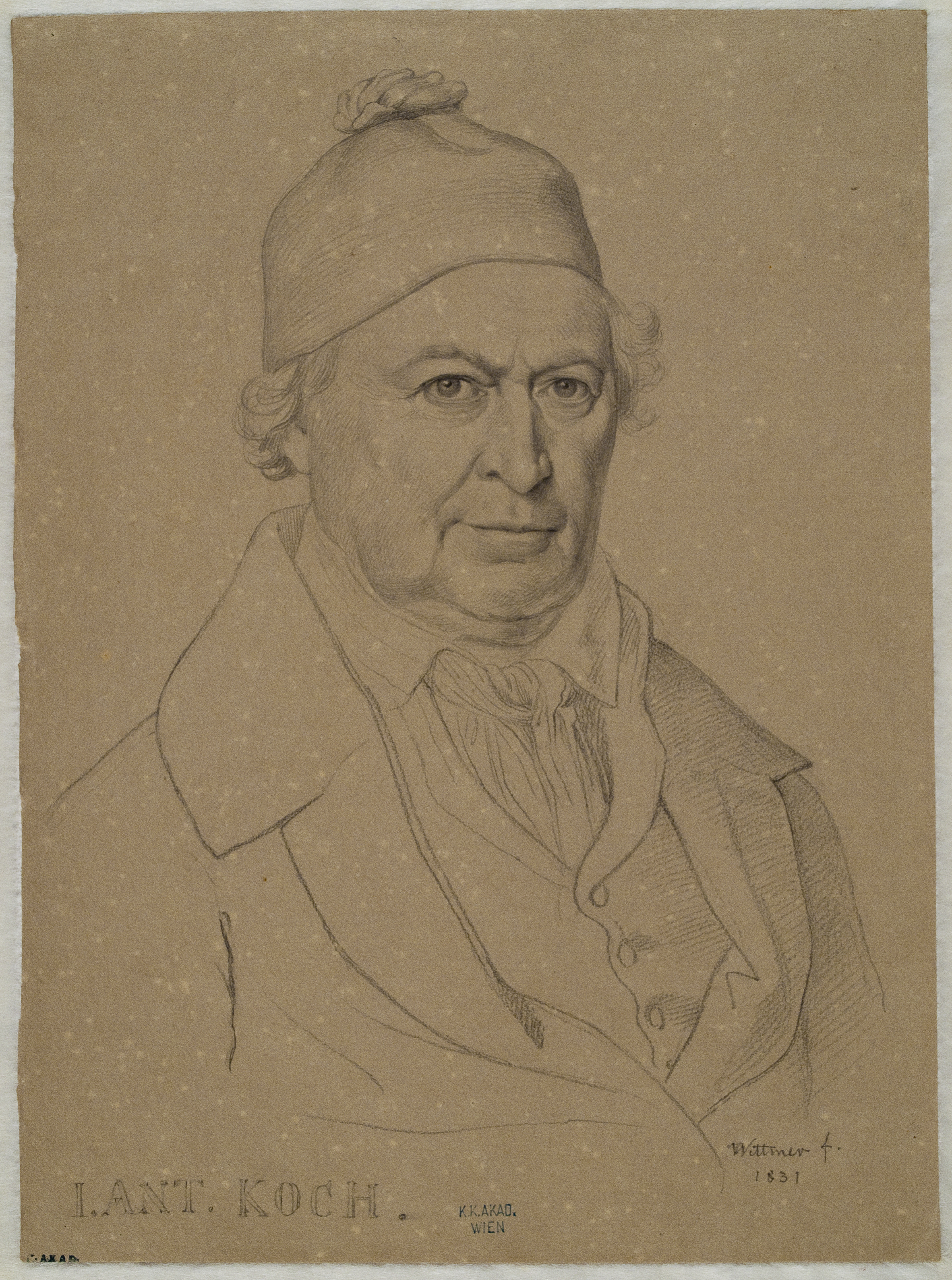 Das Kupferstichkabinett der Wiener Akademie besitzt einen der größten Bestände an Zeichnungen von Joseph Anton Koch, die bis auf wenige Ausnahmen als geschlossenes Konvolut aus dem Nachlass des Künstlers 1865 in die Sammlung gelangten. Der Bogen spannt sich von den frühen Schweizer Naturstudien über seine groß angelegten Illustrationszyklen zu Werken der europäischen Literatur (Dantes Divina Commedia, Macphersons Gesänge des Ossian, Tragödien des Aischylos), von mythologischen und christlichen Themen bis zu seinen späten Naturstudien in der Umgebung von Rom. Abgesehen von den Originalzeichnungen gelangten mit der Porträtzeichnung Kochs von Johann Michael Wittmer sowie mit der Karikatur des Künstlers beim Malen des "Schmadribachfalls" von seinem Mitarbeiter Hieronymus Hess zwei Bildnisse des Malers in die Sammlung, die viel über die Persönlichkeit und das Temperament des sowohl jovial-freundschaftlichen als auch zu impulsivem Zorn und beißender Kritik fähigen Künstlers aussagen.