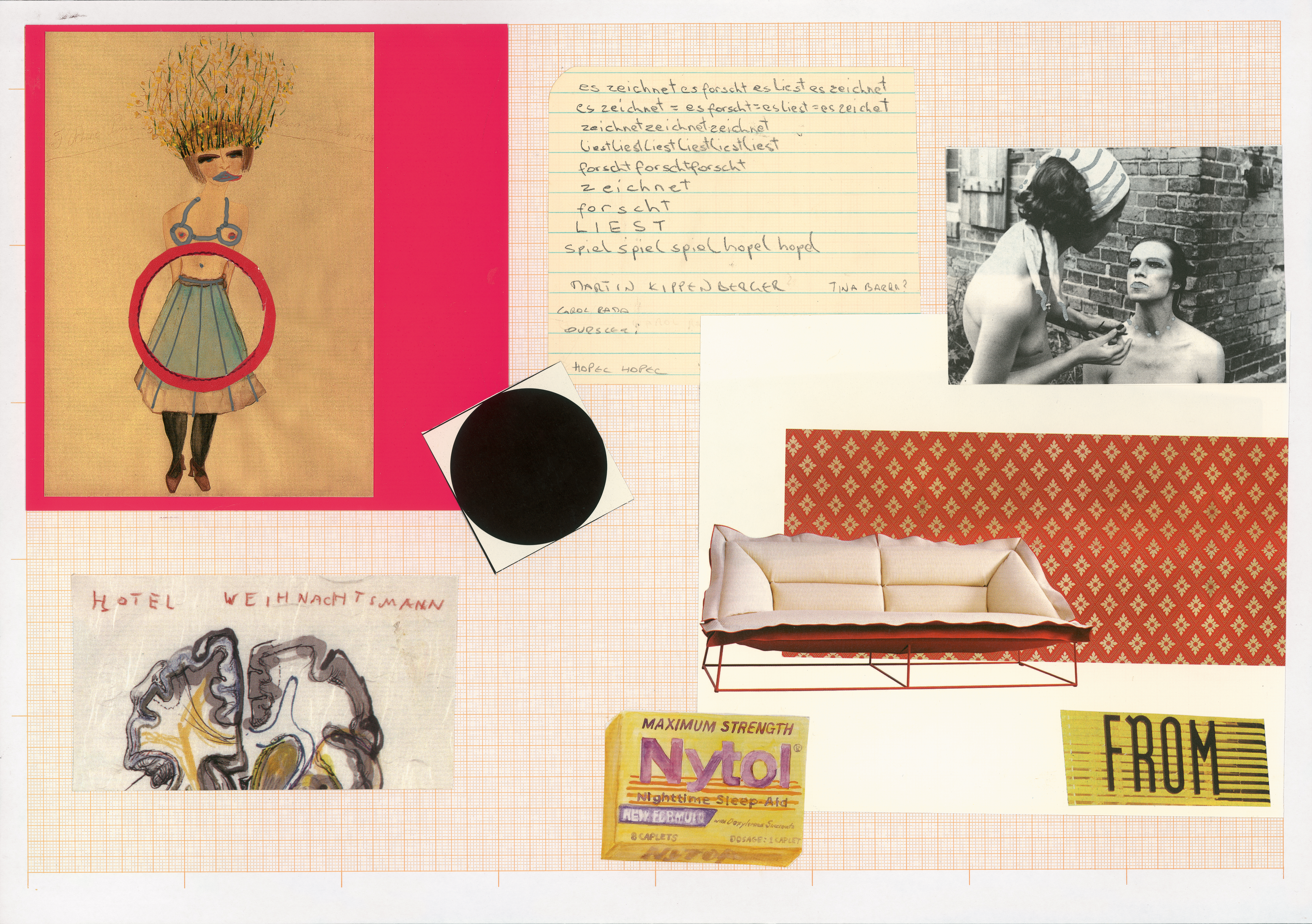 Es zeichnet, Es forscht von Carola Dertnig, 2010, am Bild: Carol Rama,Tina Bara, Martin Kippenberger,Tony Oursler, Auqarell, Photo Collage, 29 x 41cm