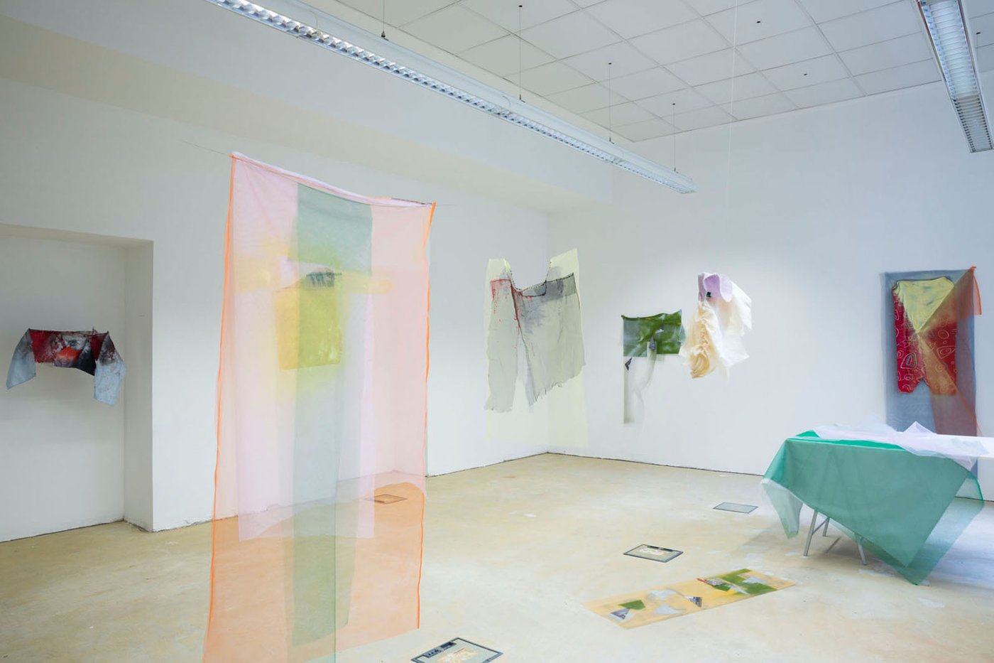 In der Ausstellung ist eine Installation aus Stoffobjekten und Zeichnungen zu sehen, die von einer Performance aktiviert wird. Myriam Khouri setzt sich als Performerin zu den Stoffobjekten in Beziehung. Gesprochen wird ein szenischer Monolog, der von ritualhaften Handlungen unterbrochen wird. Als Gobelins, Fahnen und Reliquien verkleiden die Stoffobjekte den Büroraum und betonen die ihm bereits eingeschriebene narrative Struktur. Aquarelle von Vasen und barocken Spitzen erweitern die Installation. Ihre detaillierte Darstellungsweise zeugt von einem obsessiv überhöhenden Blick auf die Dinge. Das Büro bleibt auch nach der Performance eine Bühne, auf der die Kostüme, Fahnen und Bilder für alltägliche Inszenierungen schon bereit liegen.