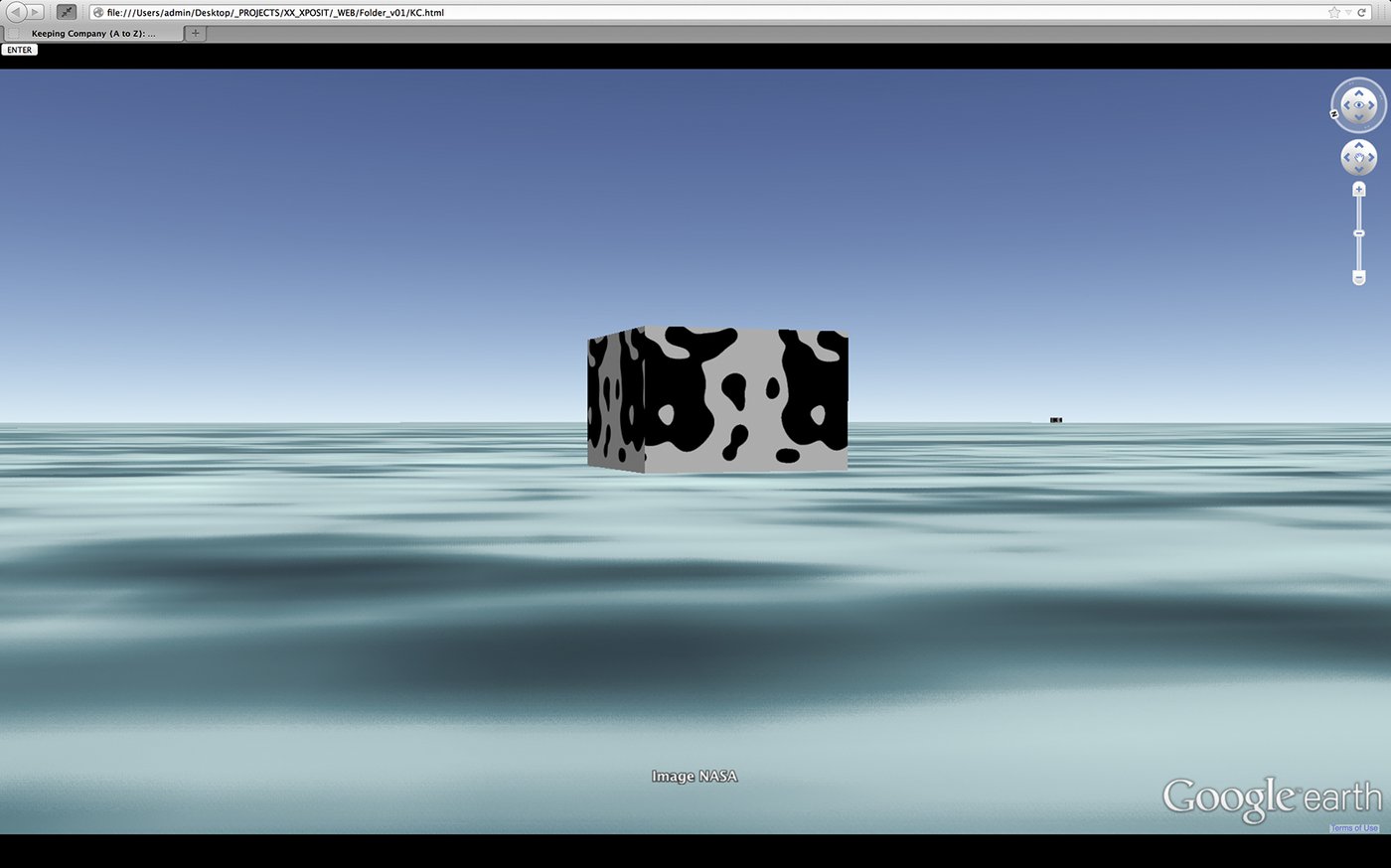 Für seinen Ausstellungsbeitrag "Keeping Company (A to Z): …" lädt Lukas Heistinger fortlaufend andere Künstler_innen aus seinem Umfeld ein, Arbeiten für die digitale 3D-Umgebung von Google Earth zu produzieren. Die auf einem Monitor in der Ausstellung gezeigten, konstant im Moment des Betrachtens generierten und aus dem Internet geladenen Kamerafahrten und Ansichten, setzen dabei das Modell mit seinen beschreibenden, sowie bildgebenden Eigenschaften in Beziehung. In einem Wechselspiel zwischen partizipativer Netzkultur und kollaborativem Werk, entsteht eine medial hybride visuelle Landschaft, deren Abbilder und Gegenstände sich ihrer formgebenden zeitlichen Struktur zuwenden.