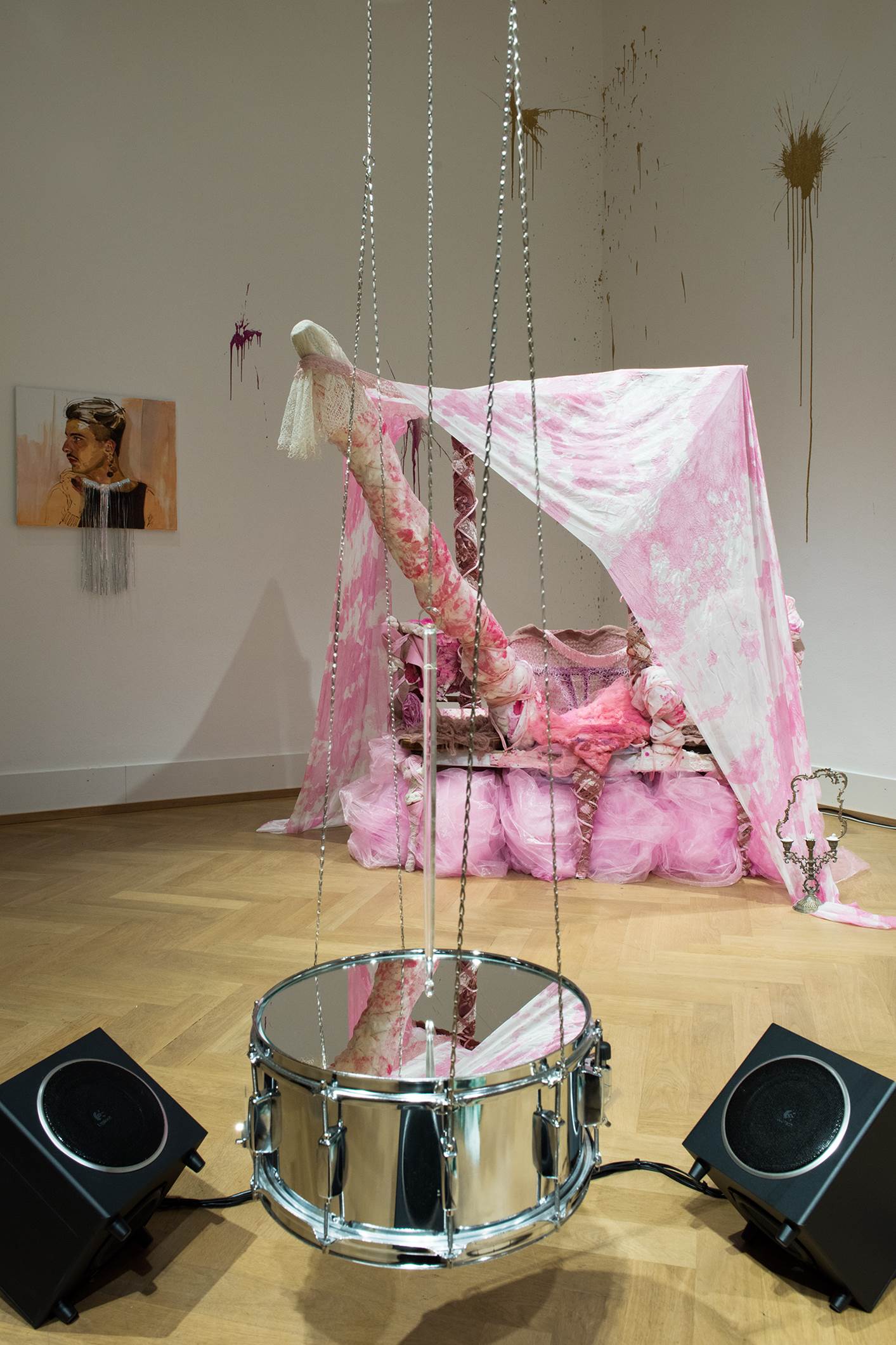 Mit Arbeiten von vorne nach hinten von Veronika Eberhart O Dolcezze Amarissime D’Amore (Installation), Moritz Gottschalk Wenn das Leben dich pudert, warte ab, ob es danach noch kuscheln will (Stoff-Installation), Michal Rutz Georgetta (Malerei)