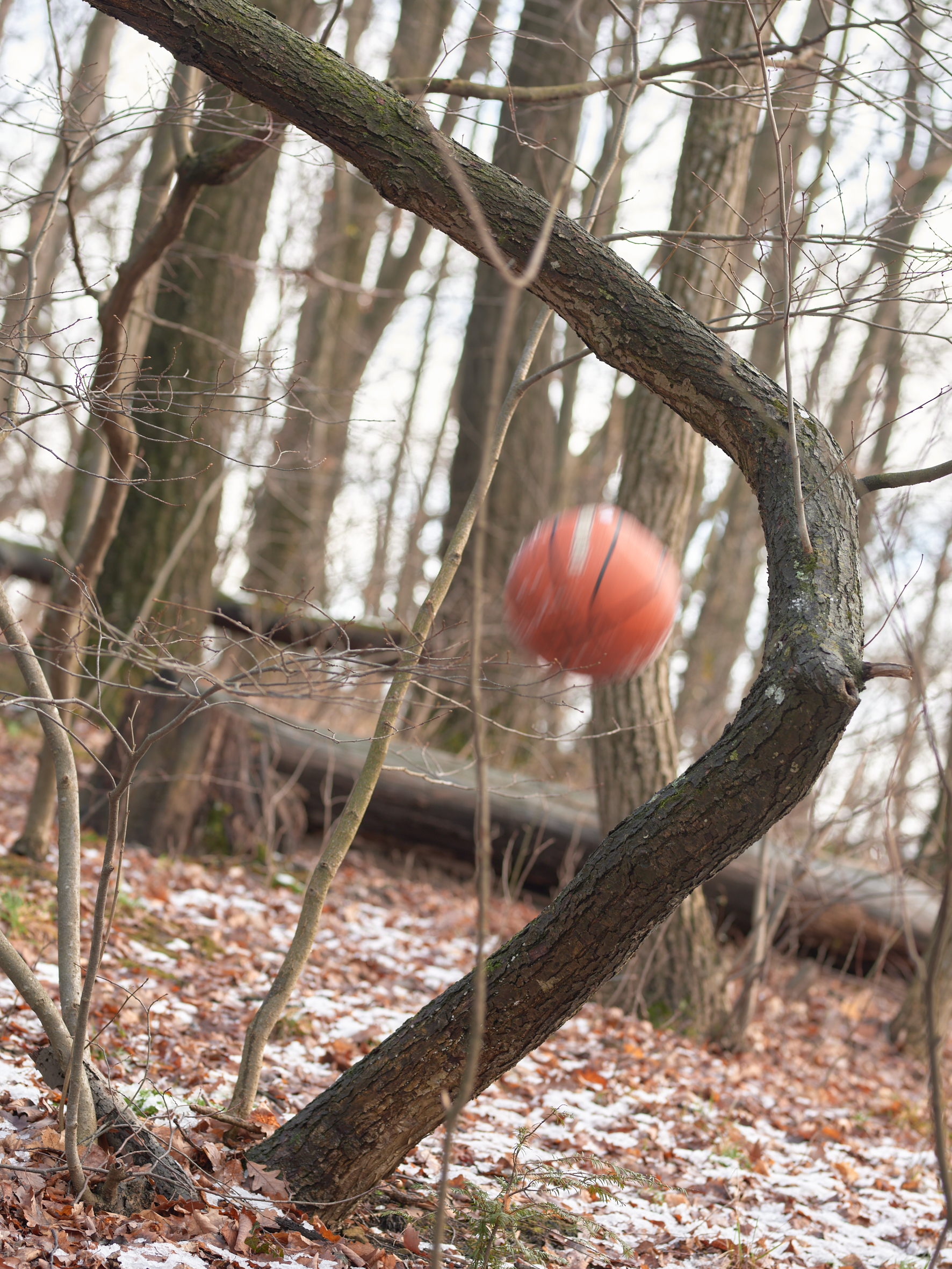 Wald mit einem geschwungenen Stamm in der Bildmitte an dem ein Basketball vorbeifliegt