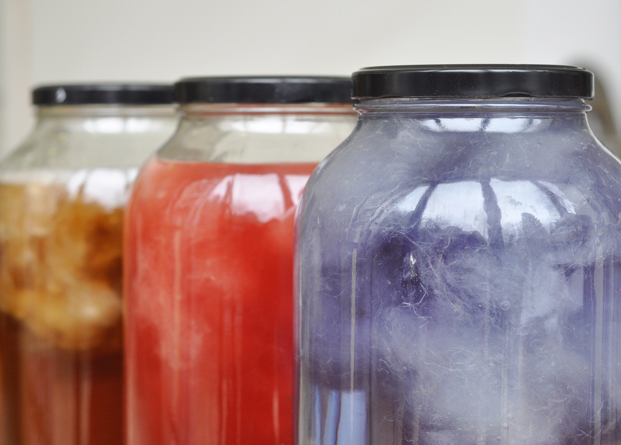 Drei verschlossene Einwegkläser mit gelber, roter und lila-blauer Flüssigkeit gefüllt