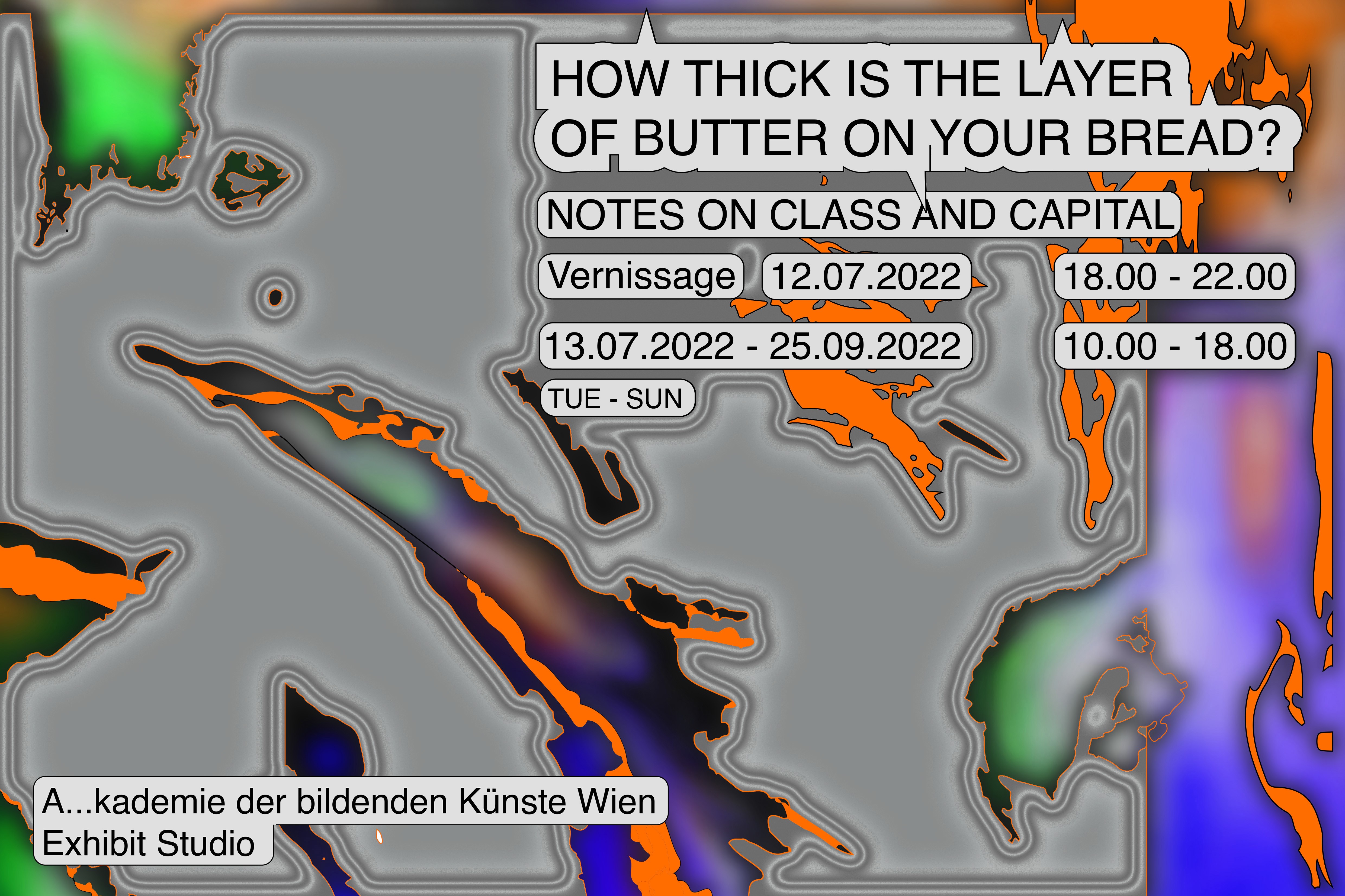 How thick is the layer of butter on your bread? Notes on class and capital, Exhibit Studio, 13.7.–25.9.2022 Flyer der Ausstellung "How thick is the layer of butter on your bread?" auf buntem Hintergrund mit schwarzer Schrift How thick is the layer of butter_Website Startseite.jpg image/jpeg Typ image/jpeg Dimension Abmessungen 4961x3307 Size Dateigröße 2.1 MB Herunterladen Bild in voller Größe anzeigen…