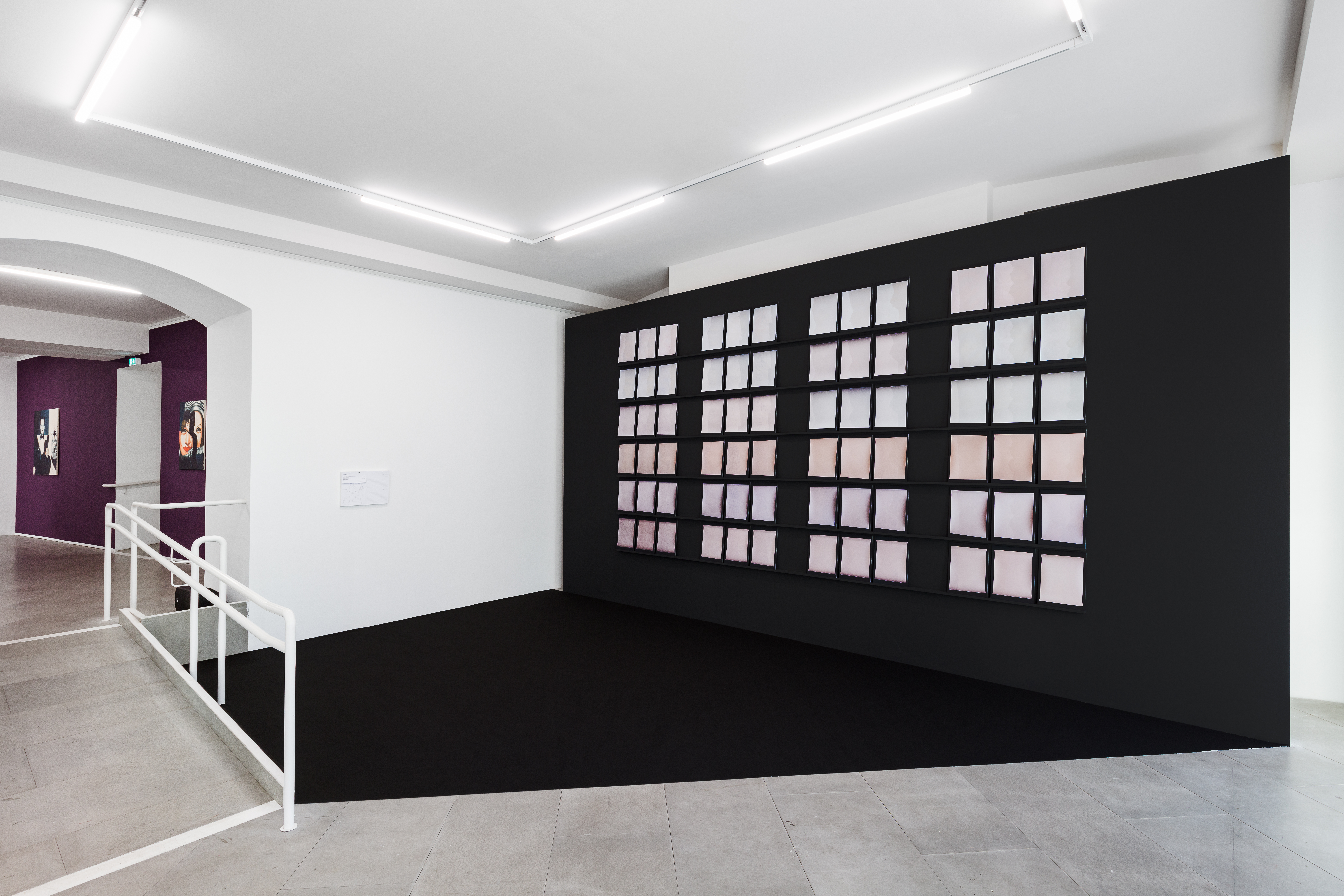 Auf einer Art schwarzen Bühne sieht man 4 Blöcke von jeweils 3 x 6 Reihen von Montioren, die wie rosa Kissen wirken. Im Hintergrund Bilder auf einer lila Wand.