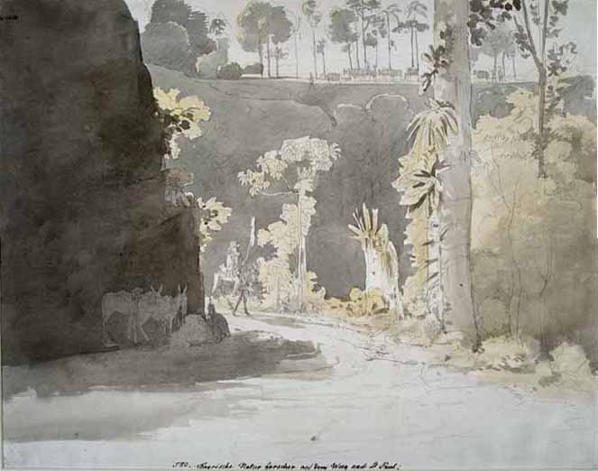 Thomas Ender war selbst nie in Minas Geraisoder in Goiás. Die hier entstandenen Blätter wurden von dem Naturforscher Dr. Johann Emanuel Pohl mit Hilfe einer Wollastonschen Camera, auch Camera Lucida genannt, angefertigt. Diese wurde von dem englischen Physiker William Hyde Wollaston (1766-1828) zum Abzeichnen von Gegenständen erfunden. Durch ein System von Prismen und Spiegeln wird der Gegenstand auf der Zeichenebene sichtbar und kann in seinen Konturen leicht nachgezeichnet werden. Die so entstandenen Skizzen wurden von Pohl in einfacher Weise mit Wasserfarben ausgemalt und dann in Wien von Thomas Ender ergänzt und korrigiert. Einzelne dieser Skizzen wurden dann als Illustrationen für Johann Emanuel Pohls Buch "Reise im Innern von Brasilien", Wien 1832, ausgewählt. Als Vorlagen für die Kupferstiche von Johann Passini und Joseph Axmann für Pohls Reisewerk stellte Ender jedoch eigene Arbeiten mit reicher Staffage an Personen und Pflanzen zur Verfügung.