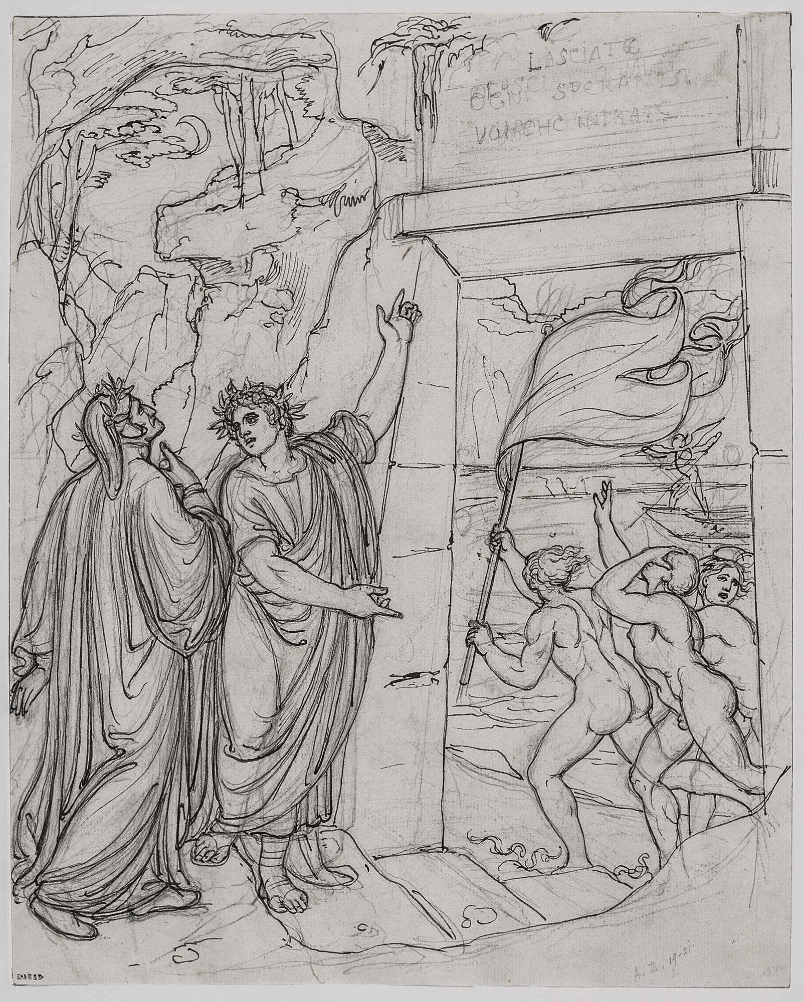Joseph Anton Koch, Der Eintritt durchs Höllentor , Dante: Göttliche Komödie , Inferno, 3. Gesang, um 1803 Feder in Braun über Bleistift © Kupferstichkabinett der Akademie der bildenden Künste Wien