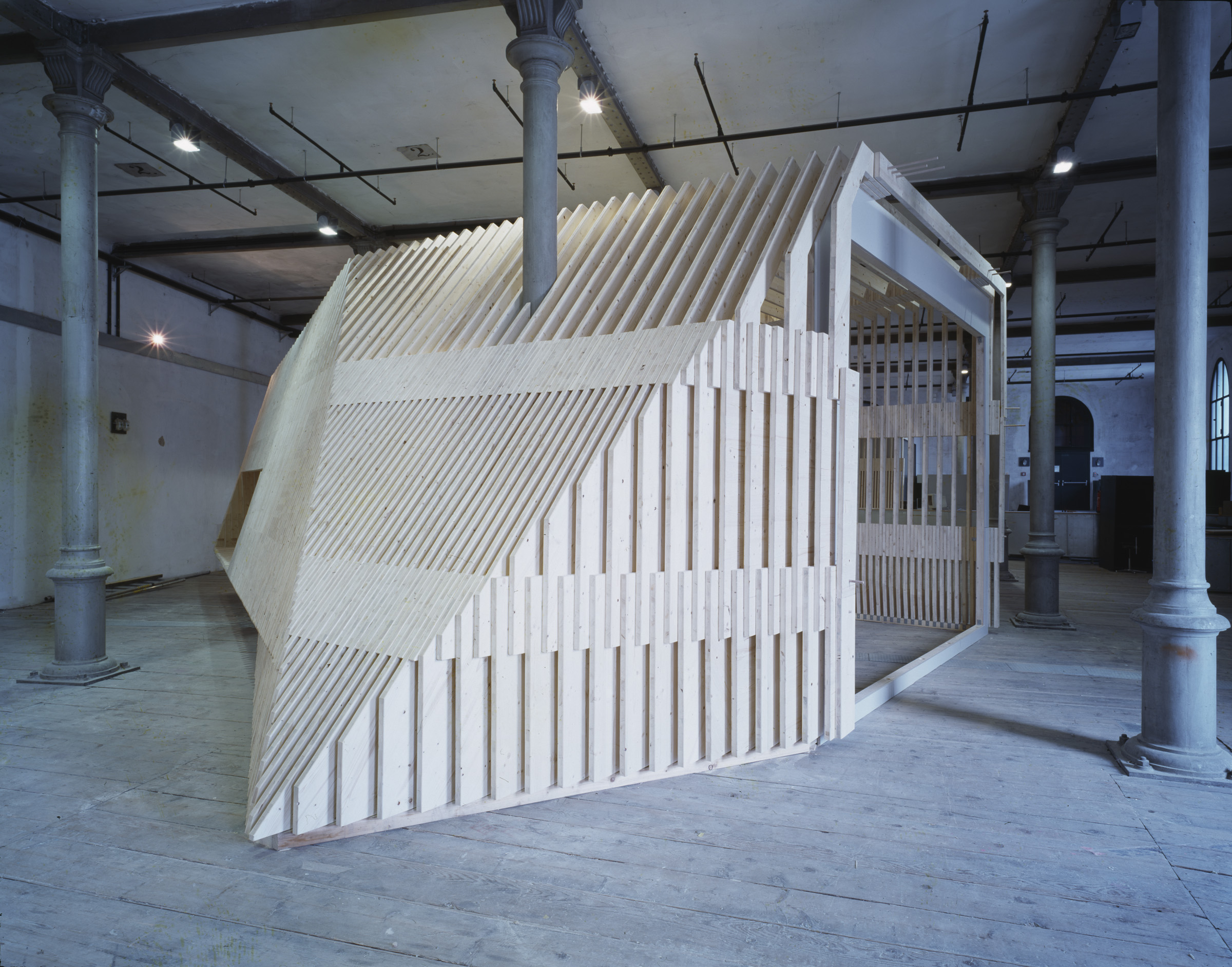 Die Pavillons sind aus einer Serie von 4 cm dicken Holzrahmen konstruiert und treten mit den vorhandenen Holzdielen in Dialog. Die vertikale Schichtung der profilierten Tischlerplatten stellt jedoch eine unorthodoxe Aneignung des bestehenden Holzmaterials dar. Die Rahmenprofile sind CNC-gefräst und werden durch ein digitales Modell direkt angesteuert. Nur durch die computergesteuerte Fabrikation ist das hohe Maß an Differenzierung und die Fertigung 1600 unterschiedlicher Einzelteile überhaupt denkbar. Dennoch war der Aufbau und Transport, sowie das Sortierten eine logistische Herausforderung: Jedes Element wurde mit einer Codierung und drei Referenzlöchern zur exakten Montage versehen. Die differenzierte Holzstruktur wird so, zu Tragwerk und Ornament zugleich. Durch ihr Spiel mit Licht und Schatten erzeugt sie wechselnde Tiefenwirkungen.