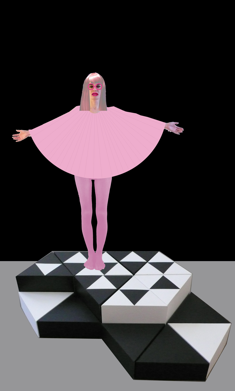 Betrachten wir den Entwurf der Bühnenansicht für Doris aus der Vogelperspektive, dann erkennen wir ein gleichseitiges Dreieck und an dessen Längsseiten jeweils eine kleine modular aufgebaute farbige Bühnenkonstruktion. Ein schlichtes und minimalistisches Setting für die 3-Kanal Videoinstallation von Bernadette Anzengruber, die dieses Jahr für den Birgit-Jürgenssen-Preis der Akademie der bildenden Künste Wien ausgewählt wurde.
