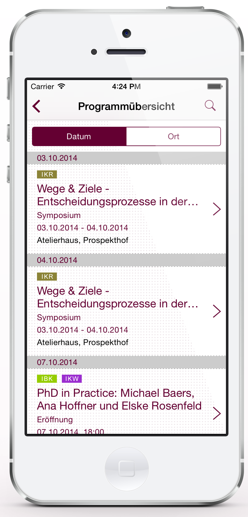 Hier können Sie sich das gesamte Veranstaltungsprogramm nach Ihren persönlichen Vorlieben und nach Datum und Uhrzeit sortieren und über eine Scheduling-Funktion individuell speichern. Die Rubriken Ausstellungen|Vermittlung, Vorträge|Events und Konferenzen schaffen einen besseren Überblick nach jeweiligem Interessensgebiet. Detailinformationen zu den einzelnen Programmpunkten und einen Raumplan erhalten Sie in den jeweiligen Einzelansichten.