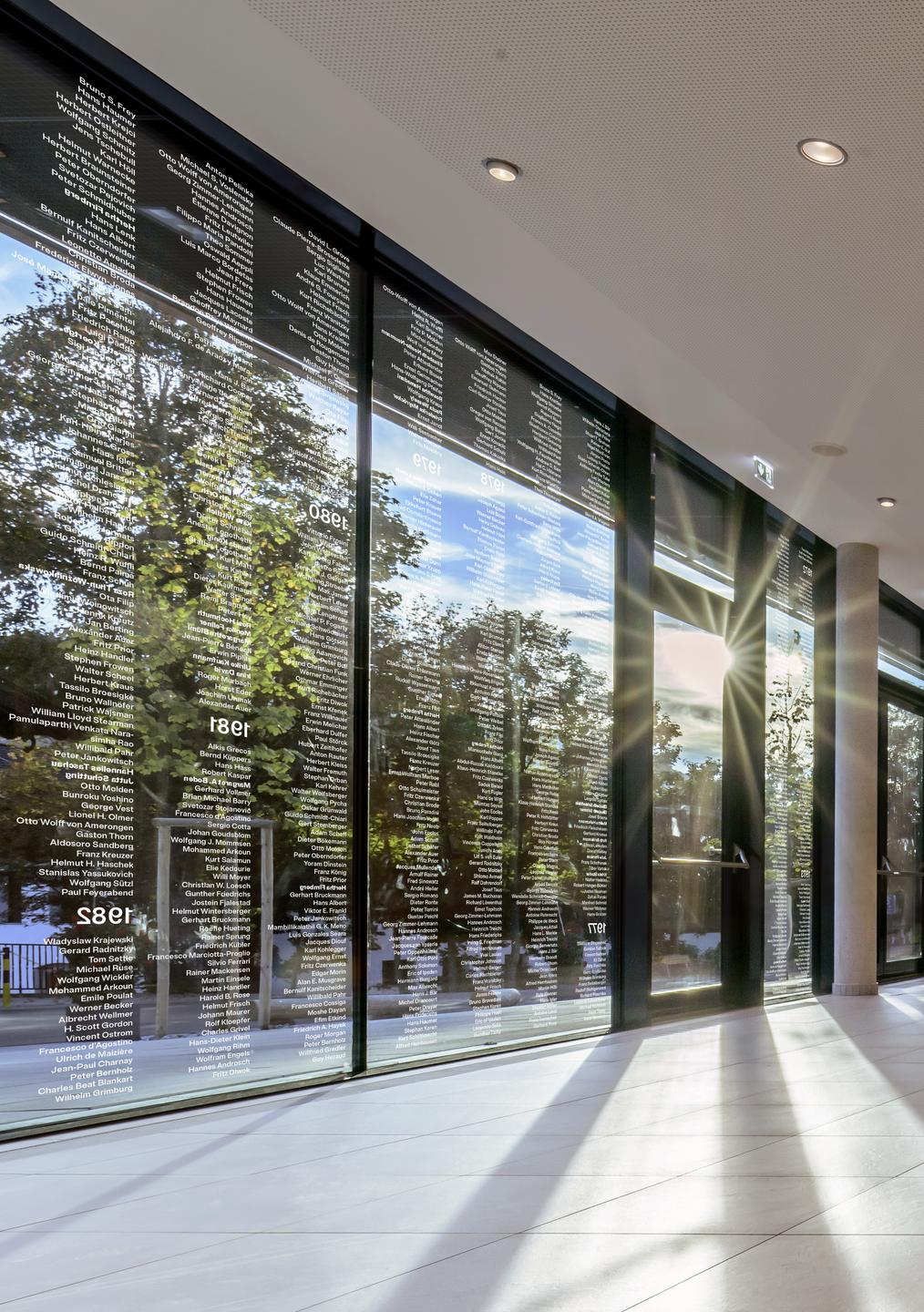 The visual realisation of the research plays with visibility and the degree of participation that can be derived from it. For this, Anna Artaker has focused on the glass surfaces of the façade and inside between the foyers. On the outsides, one can read the dates and the names of the women in bold print. The men's names are written in mirror writing and can only be read comfortably from the inside.