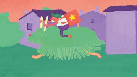 Zeichnung einer Person mit weißem Shirt und roter Tasche mit gelbem Stern reitet auf einem grünen haarigen Wesen mit Hörnern, Im Hintergrund ein Baum. grüne Wiese und Lila Häuser