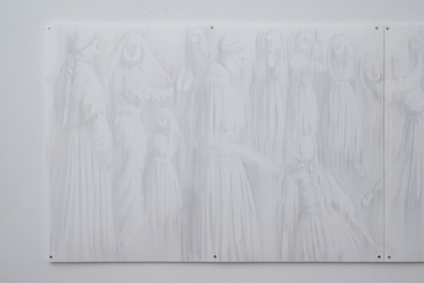 "Bereits für meine Diplomausstellung La Sombra (2025) habe ich mich mit dem Fries als Form einer nicht-linearen, spekulativen Erzählung beschäftigt, die ich in Ägypten - einem Ort, an dem Bild und Architektur seit Jahrtausenden über horizontale Erzählungen in Stein und Pigment verbunden sind - weiter behandeln möchte. Ich möchte in Kairo den Fries als Form des Erinnerns untersuchen – als Übergang zwischen Architektur, Körper und Bild. Dabei interessiert mich sowohl die ikonografische Deutung als auch das formale Prinzip der Wiederholung und des Verschwindens, das sowohl in ägyptischen Reliefs als auch in meinen geisterhaften Figuren erscheint. Durch das Studium historischer Wand- und Friesformen, Pigmente und Bindemittel möchte ich eine Werkserie entwickeln, die das Prinzip des „ephemeren Bandes“ in eine zeitgenössische Zeichnung und Wandarbeit überführt."