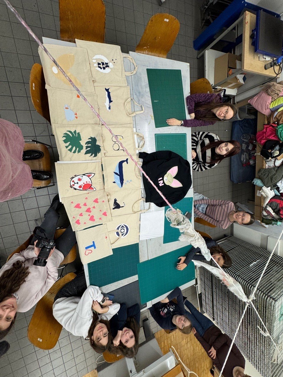 Es gab 4 verschiedene Arbeitsgruppen: Die Schüler_innen probierten sich als Tableau Vivant in analoger Fotografie und Dunkelkammerarbeit, gestalteten Gebrauchstextilien mittels Siebdruck, sie erfuhren von dreidimensionaler Gestaltung von Papier, und arbeiteten performativ in einem Schattentheater. Sichtlich genossen die jungen Menschen die großzügige Werkstättenatmosphäre außerhalb ihrer gewohnten Schulumgebung. Diese schöne Zusammenführung von Ausbildungsinstitution für das Lehramt, freien Kunstschaffenden und Schule wurde durch das OEAD-Förderprogramm „Kulturvermittlung mit Schulen“ ermöglicht.