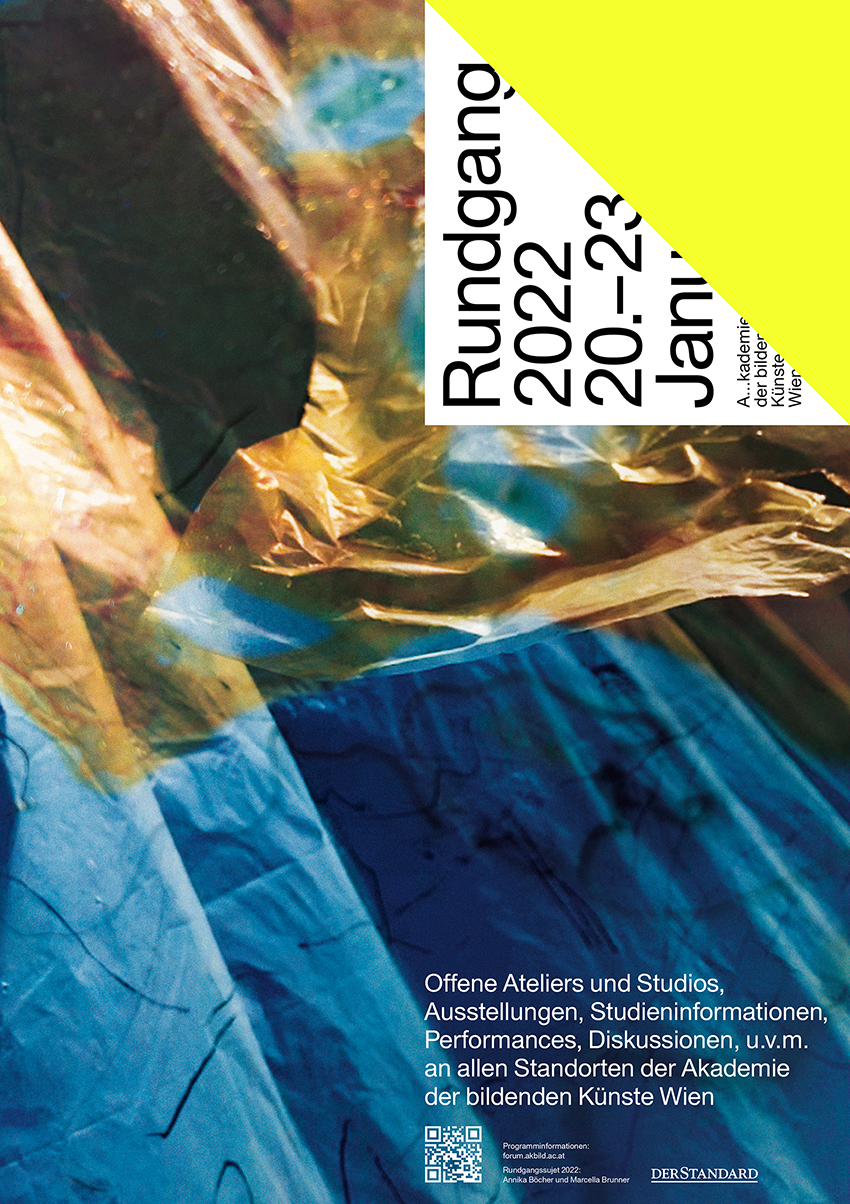Von 20. bis 23. Jänner 2022 findet an allen Standorten der Akademie der Rundgang 2022 statt. Die Klassen öffnen ihre Ateliertüren und Studios, es finden Performances, Diskussionen und Vermittlungsprogramme statt. Bei der jährlichen Akademie Auktion 2022 stellen weltberühmte und noch weniger bekannte Künstler_innen Arbeiten zur Versteigerung bis 21.1.2022 zur Verfügung. Unterstützt werden Studierende der Akademie der bildenden Künste Wien in finanziellen Notlagen und Vereine, die mit geflüchteten Menschen arbeiten.