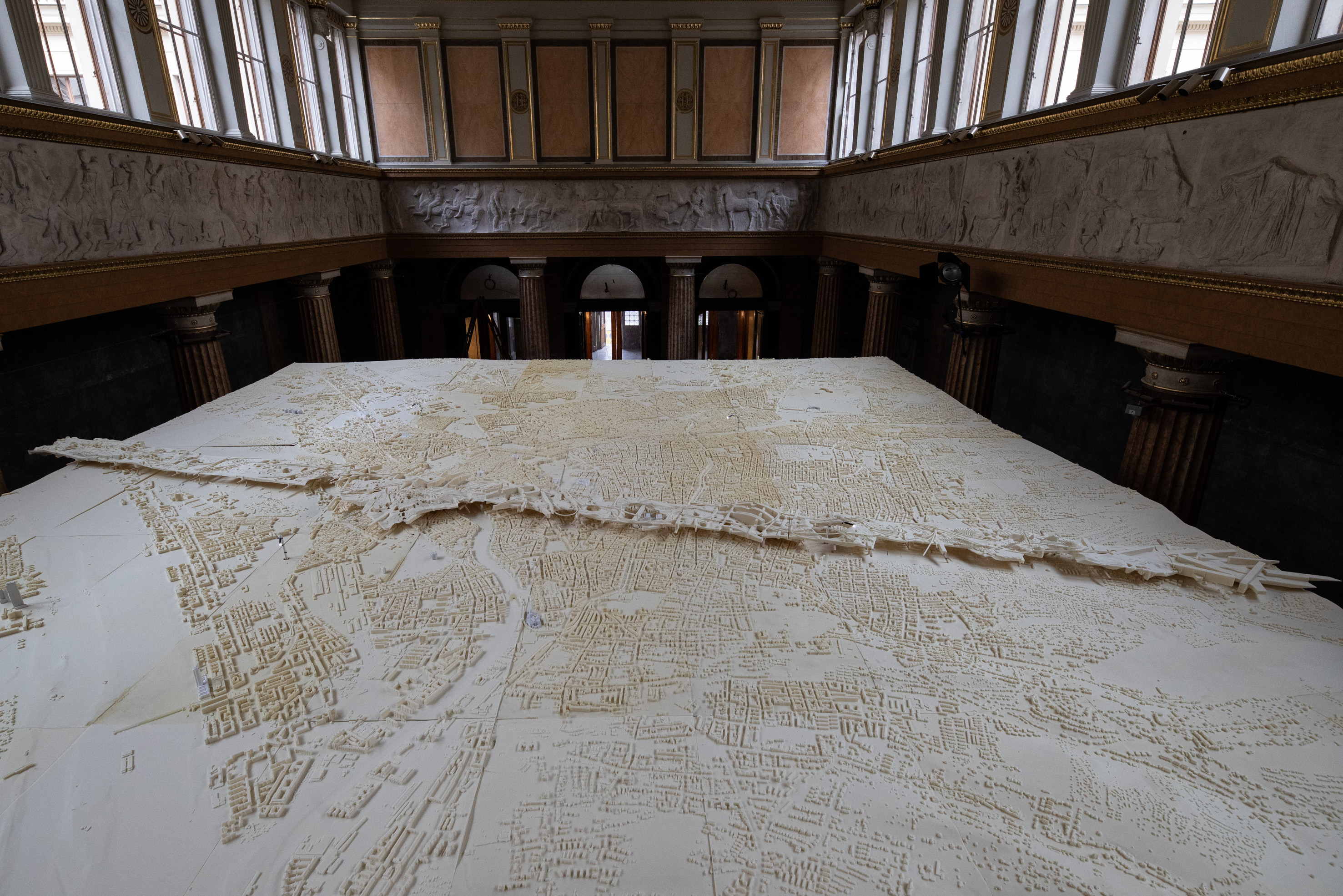 Noch während der laufenden Bauarbeiten am historischen Hauptgebäude präsentiert das Institut für Kunst und Architektur (IKA) der Akademie der bildenden Künste Wien unter dem Titel „HITZE TAKES COMMAND“ in Form einer raumgreifenden Installation in der frisch renovierten Aula von 7. Mai bis 28. Mai 2021 die Ergebnisse einer einjährigen Auseinandersetzung mit Fragen des Klimawandels und der Stadtgestaltung. War lange der Umgang mit der Kälte in Mitteleuropa die dominierende klimatische Bedingung für das Entwerfen von Architektur, so ist es inzwischen die Hitze, die Architektur und Stadtplanung herausfordert und solche technologische Lösungen erwartet, die auf den Erhalt unserer vorherrschenden klimatischen und energetischen Standards abzielen. Die Studierenden sind jedoch vielmehr der Ansicht, dass anstatt lediglich „systemerhaltend“ zu agieren, Architektur und Architekt_innen eine kritische, meinungsbildende Rolle hinsichtlich unserer Lebensweise einnehmen sollten. Die Untersuchungen im Rahmen des Jahresprojektes konzentrierten sich auf die Stadt Wien und ihre besonders vom Klimawandel betroffenen Stadtviertel, denen mit einer umfangreichen Sammlung architektonisch künstlerischen Perspektiven und Lösungsansätzen begegnet wird. Ein großformatiges Modell der Stadt Wien kann von einem Gerüst aus von oben, oder auch durch Periskope von unten betrachtet werden.
