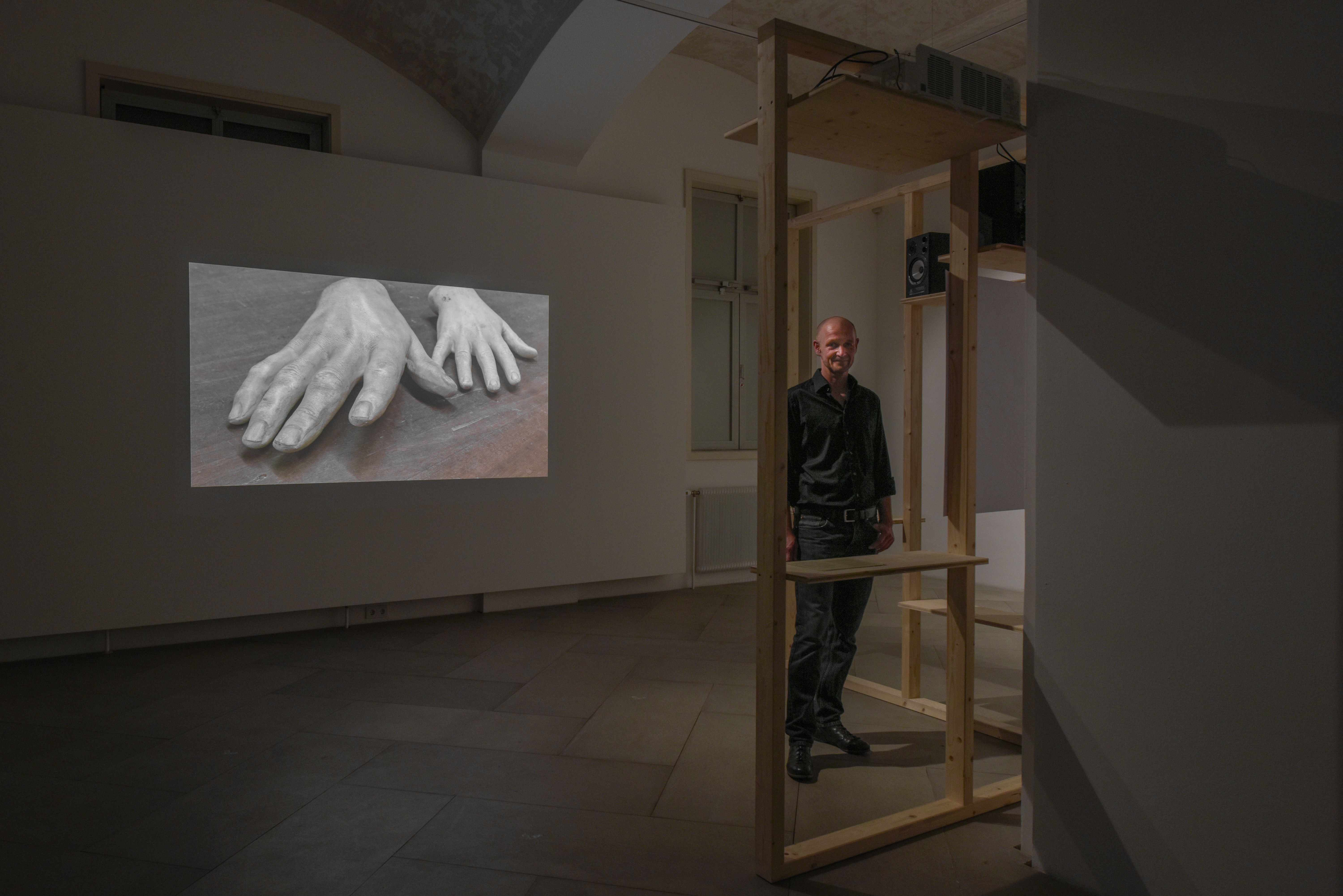 Der Künstler steht vor seiner Videoarbeit auf der man Hande sieht