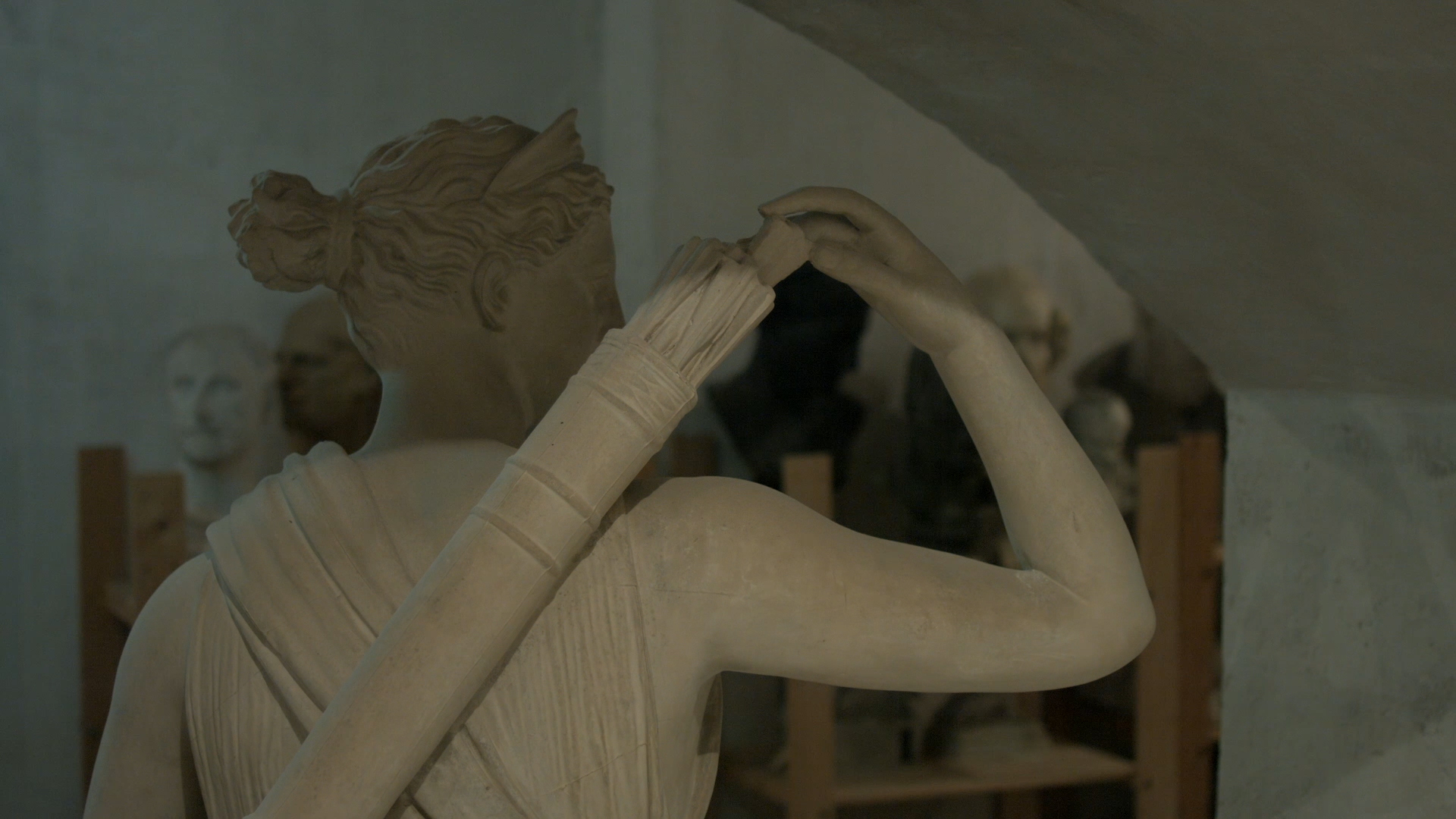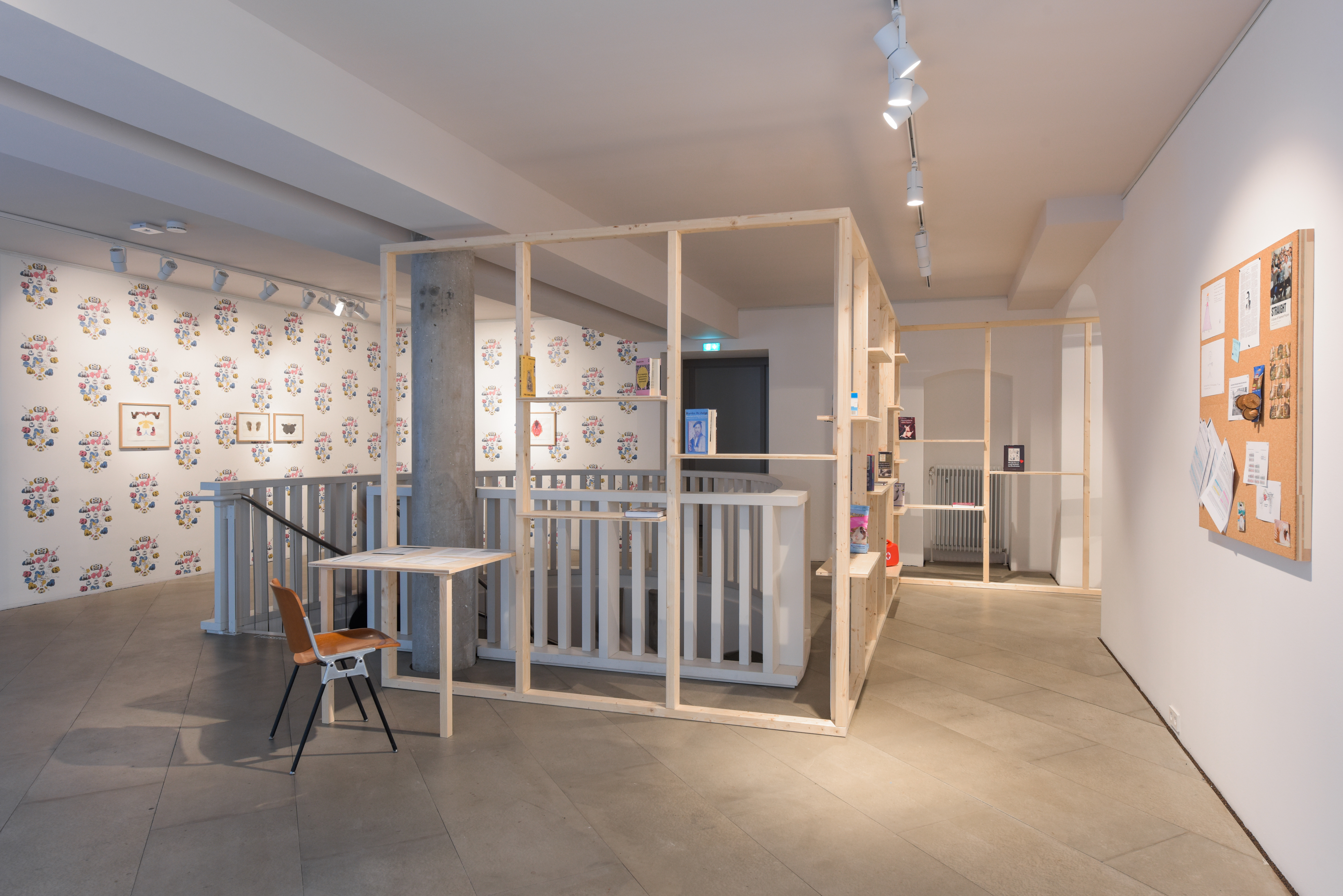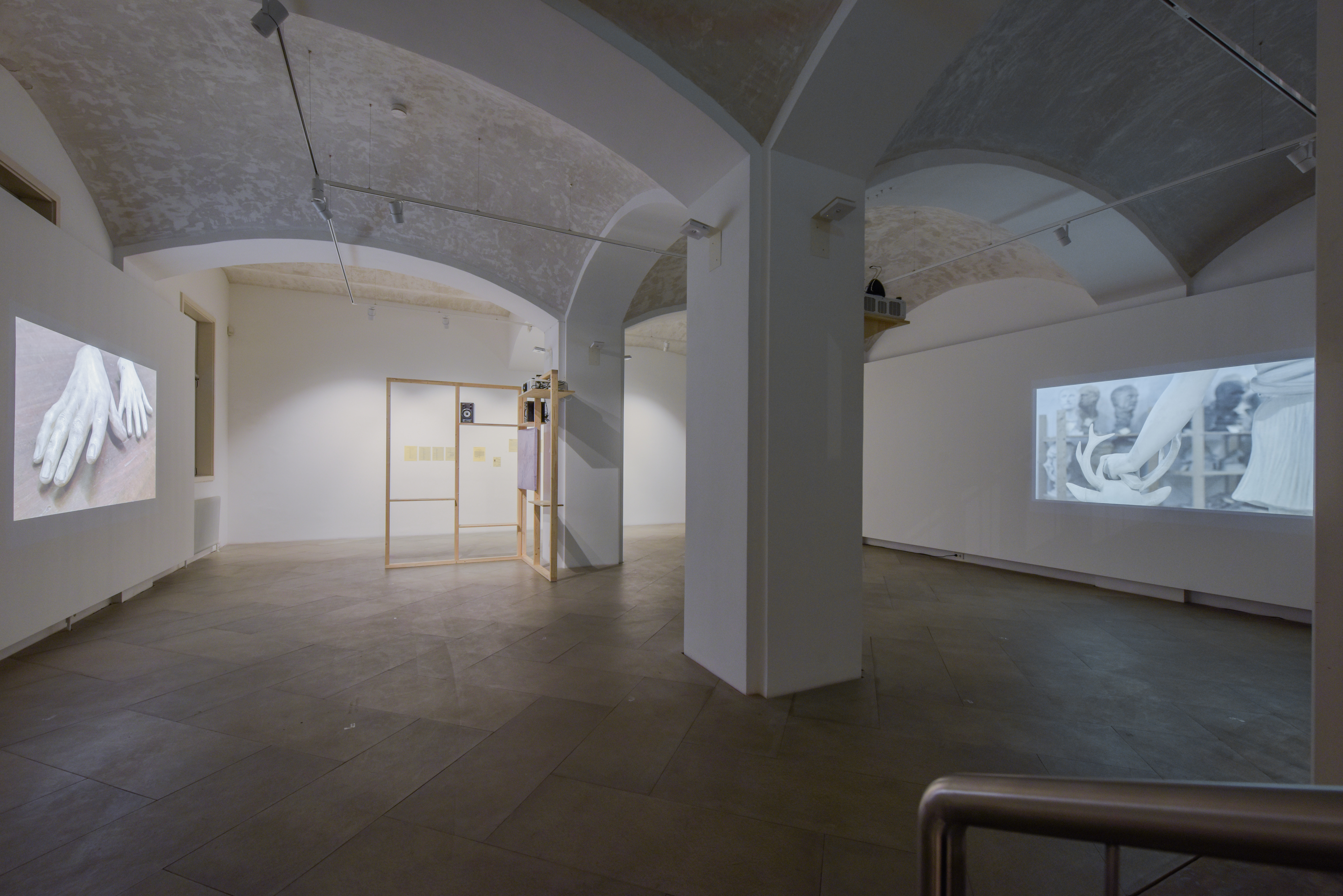 zwei Videoarbeiten an den Wänden, ein Holzgerüst in der Mitte