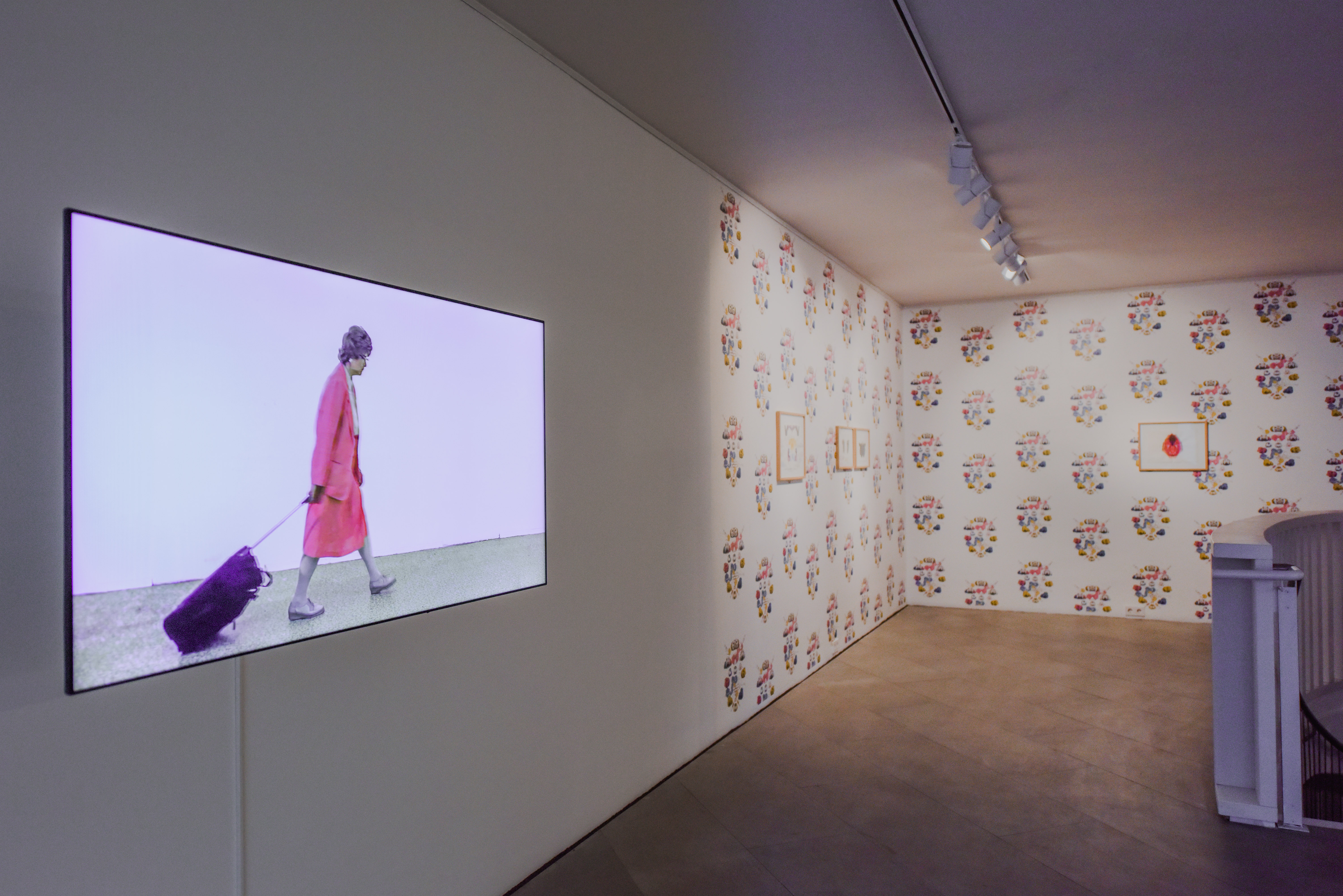 Austellungsansicht, links vorne ein Screen auf dem eine Frau einen Koffer zieht