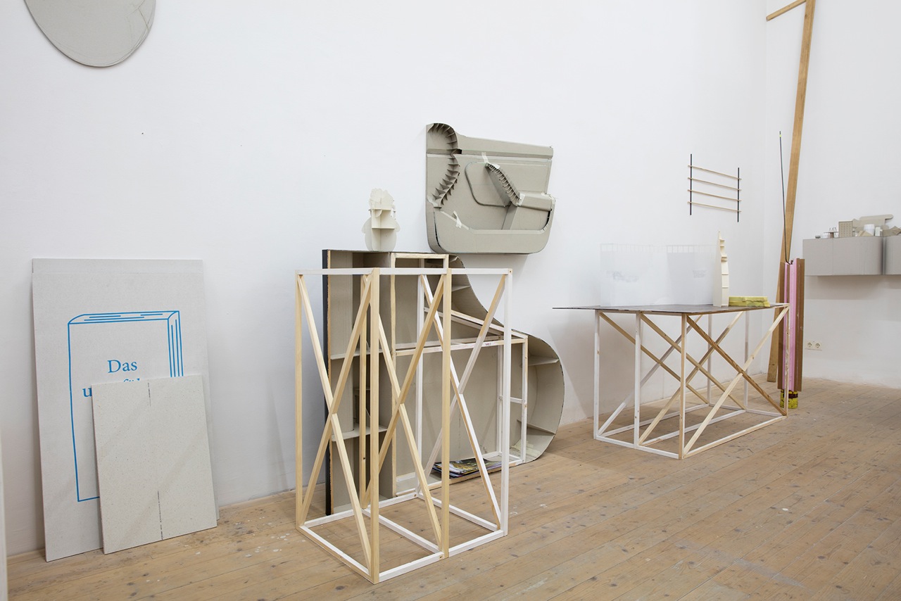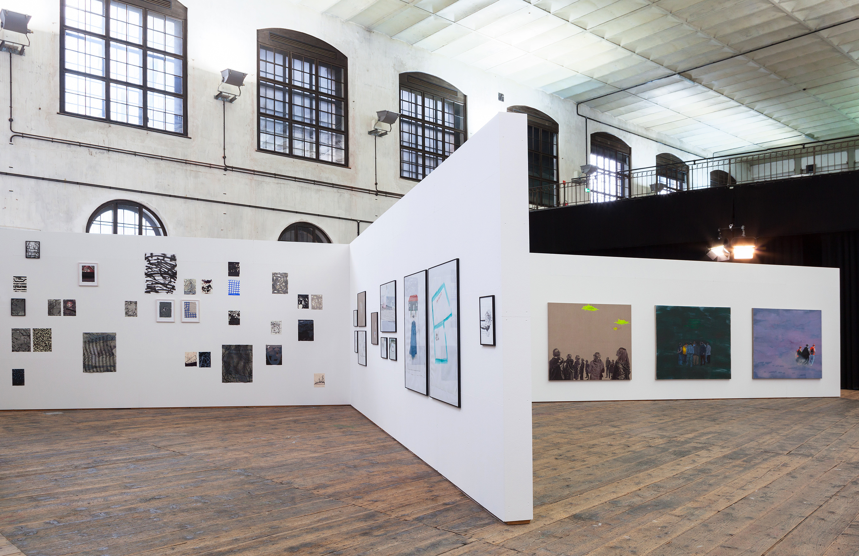 Abschlussarbeiten 15-16, Einblick in den Mehrzwecksaal, Arbeiten von links nach rechts: Jöran Möller, Martin Steininger, Malgorzata Kugler