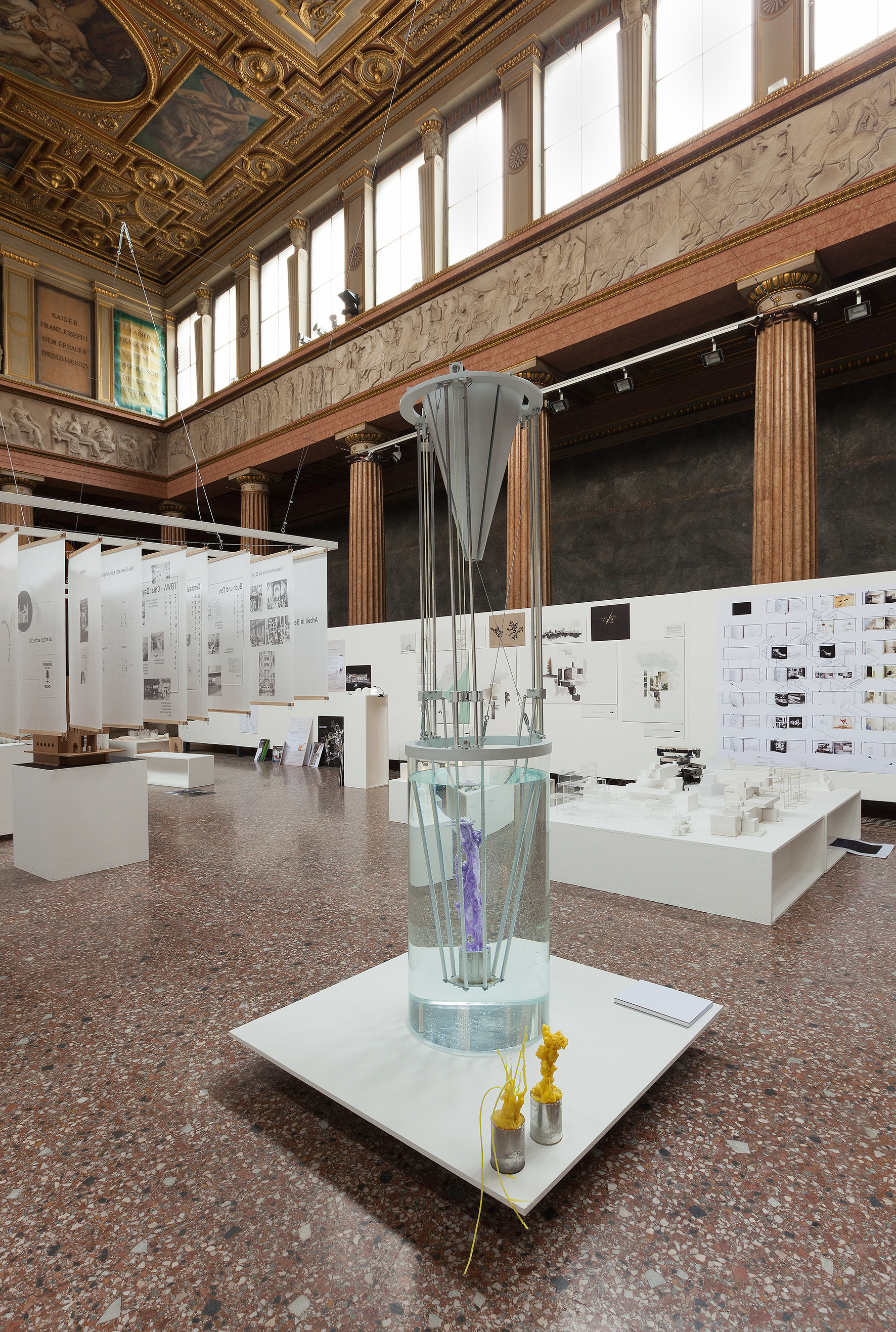 Einblick Aula, Masterarbeiten Architektur, im Vordergrund: Arbeit von Rena Giesecke, im Hintergrund (von links nach rechts): Arbeiten von Lukas Gschweitl, Alois Hehenberger, Süreya Elsa Miller, Avin Fathulla