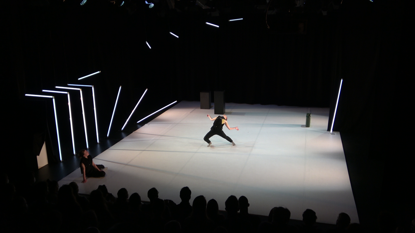 Es ging im Kern darum, die Einzigartigkeit des Individuums zu erfassen und um die Frage, wie man die authentische Leidenschaft einer Person erzählen kann, ohne dass diese sich selbst beschreibt. Eine zentrale Aufgabe an die Tänzer_innen war es beispielsweise, ihr Lieblingsbuch auszuwählen, es jedoch niemandem zu verraten. Über diesen Umweg und die Arbeit mit diesem Lieblingsbuch sollten sie sich ihrer authentischen Leidenschaft annähern. Dieses Prinzip habe ich für meine Arbeit am Bühnenbild übernommen und mich gefragt, was Individualität für mich bedeutet. Daraus ist eine Lichtinstallation entstanden, eine Art Gerüst, das zerfällt und sich wieder neu zusammenbaut. Die Kostüme waren schwarz und mit Reißverschlüssen an verschiedenen Stellen versehen, die andere Materialitäten und Farben freigegeben haben, wenn die Schauspieler_innen sie geöffnet haben.
