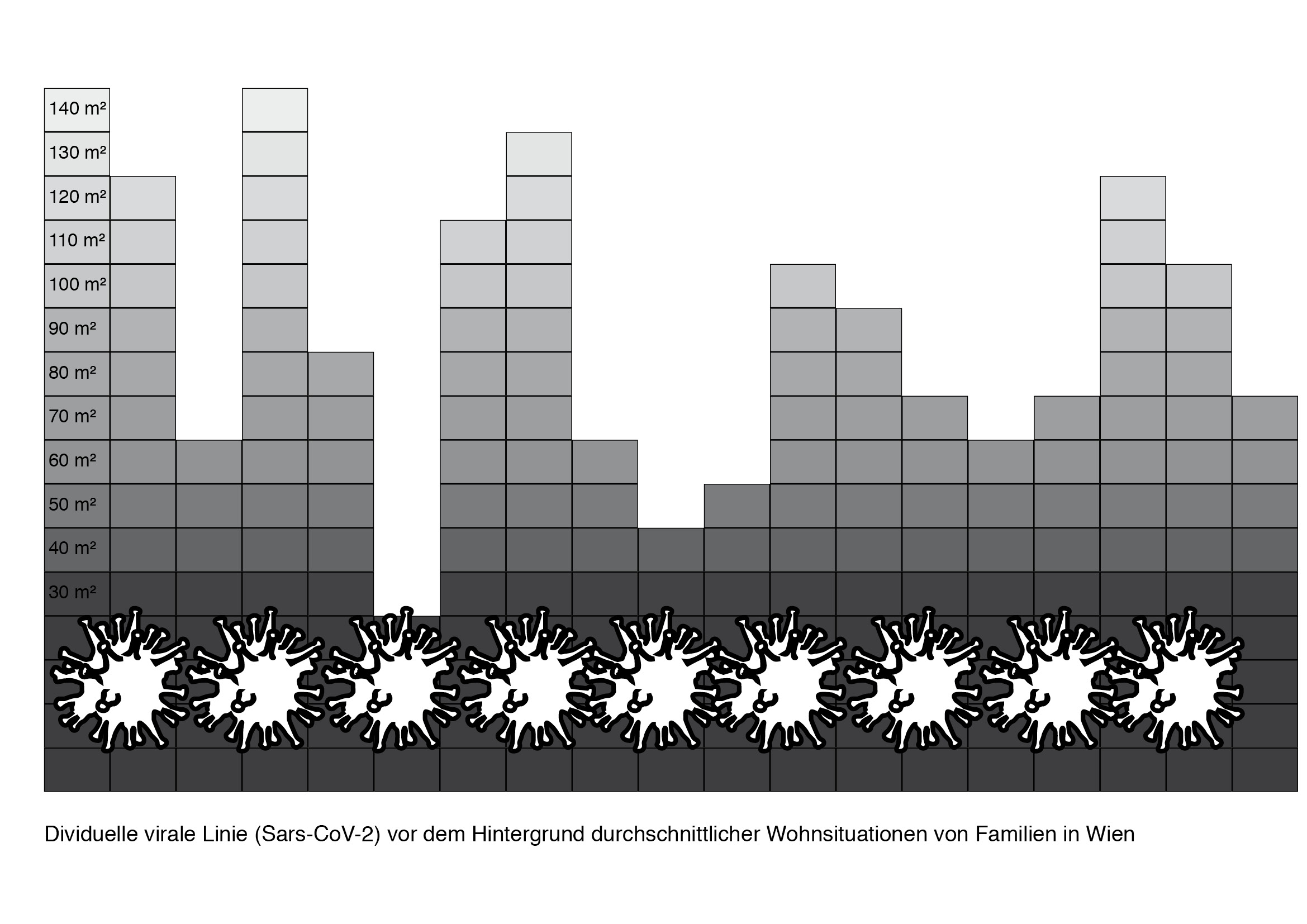 Da im Normalfall vernachlässigbare Unterschiede in Zeiten der Pandemie von einer medialen Berichterstattung aufgegriffen wurden, wurden diese sichtbar und bildeten auf diese Weise für meine Überlegungen eine Basis. Wen interessiert(e) schon die Wohnsituation Alleinerziehender (meist Mütter)? Deren durchschnittlicher Wohnraum, bestehend aus einem Zimmer, kleiner Küche, in den unteren Stockwerken gelegen und daher meist dunkel, wird – einem allgemeinen Konsens folgend – als menschenwürdig erachtet. Durch die Ausgangssperren begannen nun genau diese unspektakulären Situationen in die Öffentlichkeit zu drängen: Denn eben Personen mit beengter Wohnsituation und Kleinkindern besuchten weiterhin öffentliche Räume, vor allem Parks. Plötzlich wurden Entscheidungen wie diese, um das Leben aushaltbar zu gestalten, als potentielle Gefahrenquelle für Ansteckungen identifiziert. Stimmen aus einem linken Feld, wie die des Strategieberaters Sascha Lobo, hielten diesen Bedrohungsszenarien entgegen, dass Familien im Stuckaltbau mit neun Zimmern und Flügeltüren eine Ausnahmesituation ungleich besser verkraften könnten. [12] Und – wie er an exemplarischen Beispielen nachvollziehbar macht – wurde im Zuge des Ausnahmefalls ersichtlich, dass Entscheidungen jeweils in enger Verschraubung mit einer sozialen und, vor allem auch, finanziellen Situation zu lesen sind (ich visualisierte diese Überlegungen in der von mir gestalteten Grafik).