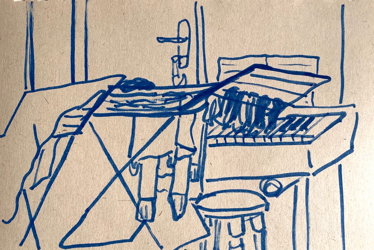 Die Ausstellung Zu Hause warten die Möbel erforscht die Wahrnehmung von Wohnräumen mit ihren Einrichtungsgegenständen. Jeder Raum bekommt durch die Menschen, die ihn bewohnen und einrichten, einen eigenen Charakter, den die Künstlerinnen Nina Gross und Donya Aalipour durch Zeichnungen und Collagen zu erfassen versuchen.