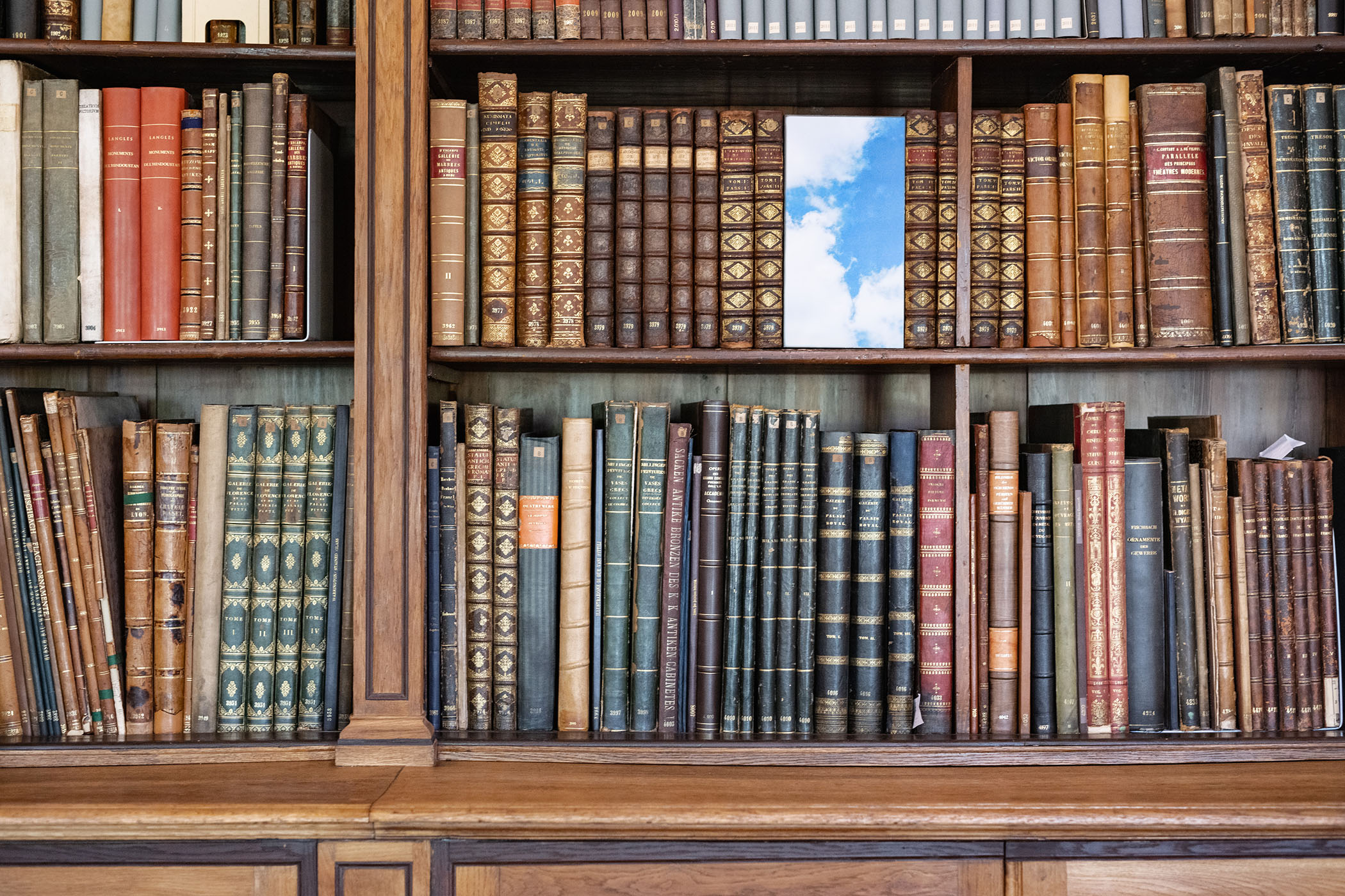 Die Farbfotografie im Querformat zeigt den Ausschnitt eines Bücherregals mit historischem Bestand, das von Theophil von Hansen für den Lesesaal der Akademiebibliothek entworfen wurde. Einige Bücher wurden entnommen, ihre Stelle zwischen den Buchrücken nimmt eine hochformatige Farfotografie mit wolkigem Himmel ein.