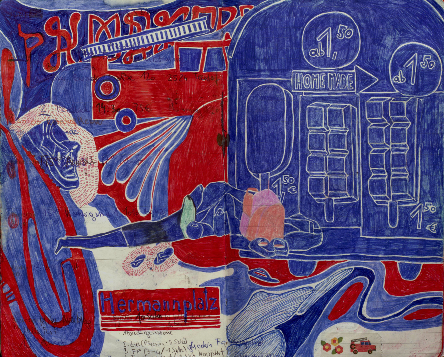 Flüchtige Skizzen im Nebenbei sind die Grundlage von Juli Augustas Arbeiten in der Akademiebibliothek. Durch die Übertragung ausgewählter Stücke auf eine neutrale, geordnete Fläche entsteht Losgelöstes und Neues - kurz gesagt: gezeichnete Zeichnungen. Das Papier dient Ina Fasching als blanker, leerer Spiegel, den sie mit Formen und Farben zum Schwingen bringt. Das Verfolgen der Linien ist der Weg aus der Imagination in die Realität. Die Zeichnungen und Siebdrucke von Felix Theile geben Fragmente absurder Erzählungen wieder, dessen Personen sich in den Überresten räumlicher Anhaltspunkte zumeist hingebungsvoll ihren Tätigkeiten widmen.
