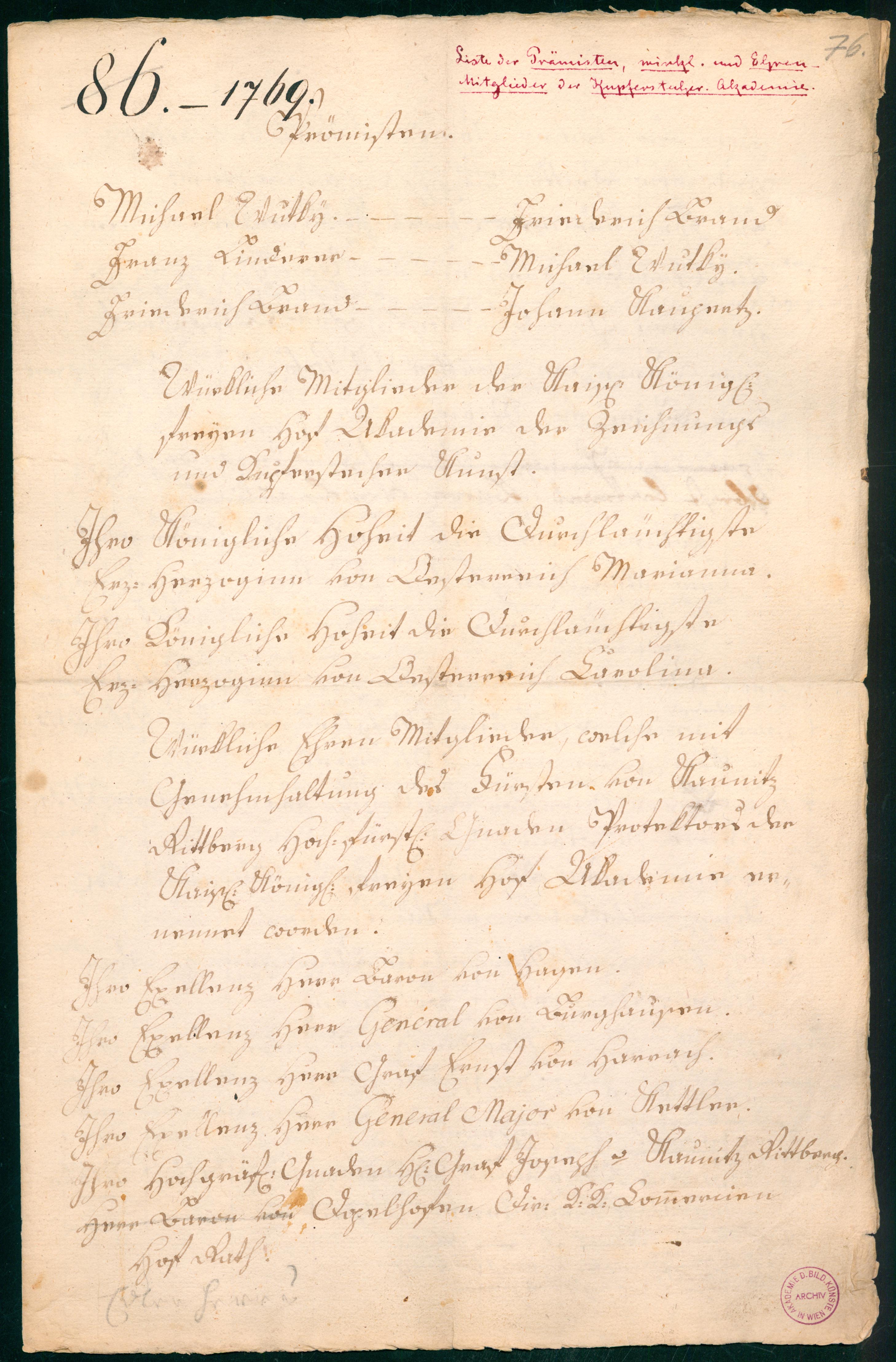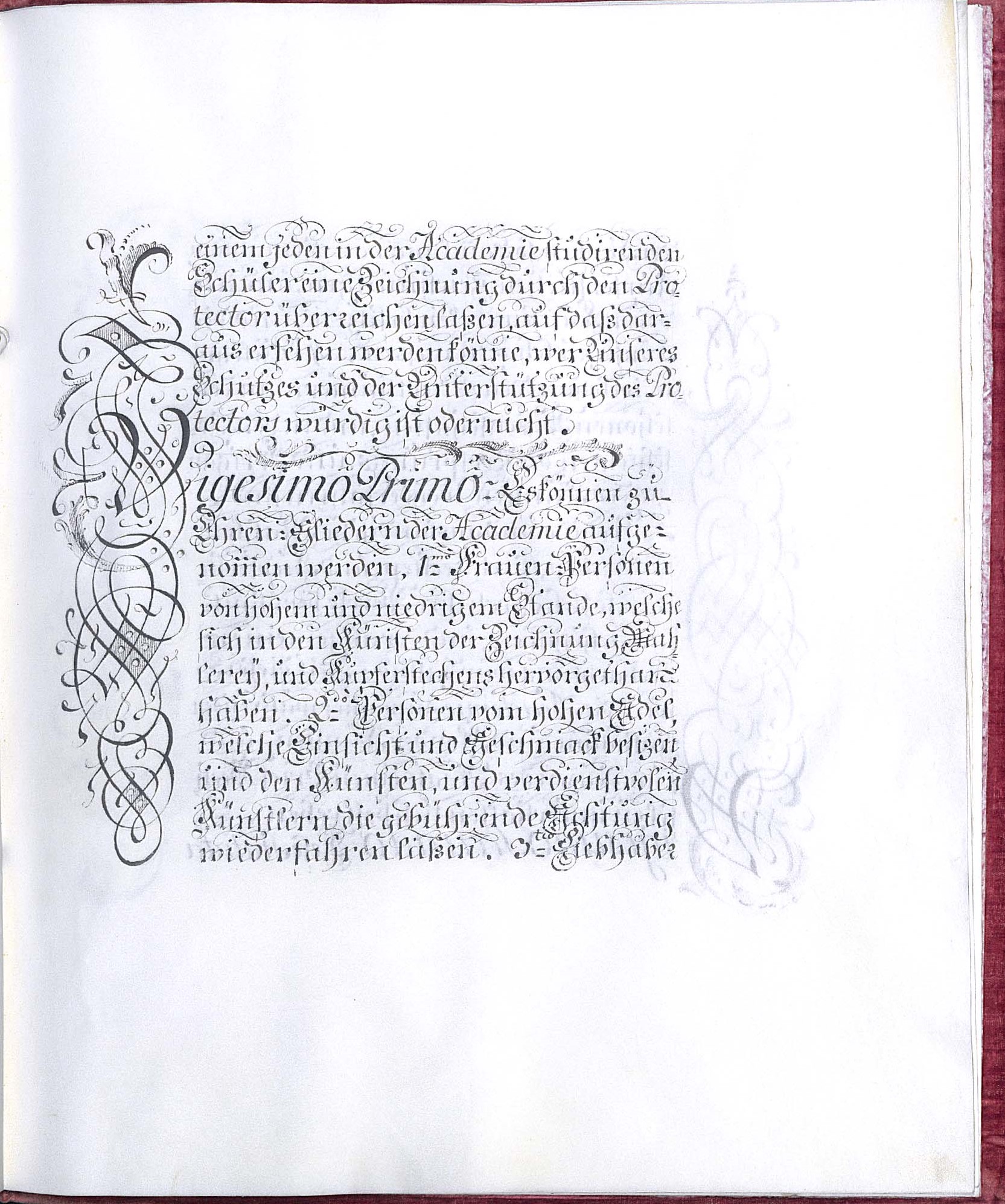 „Vigesimô Primô: Es können zu Ehren-Gliedern der Academie aufgenommen werden, 1mo Frauen-Personen von hohem und niedrigem Stande, welche sich in den Künsten der Zeichnung, Mahlerey, und Kupferstechens hervorgethan haben. 2do Personen vom hohen Adel, welche Einsicht und Geschmack besizen und den Künsten, und verdienstvolen Künstlern die gebührende Achtung wiederfahren laßen. 3tio Liebhaber der Künsten, so Sammlung von Gemählden, Kupferstichen, Zeichnungen, und anderen Kunstwercken besitzen, und die Künste zu schäzen wißen; […] “ (6)