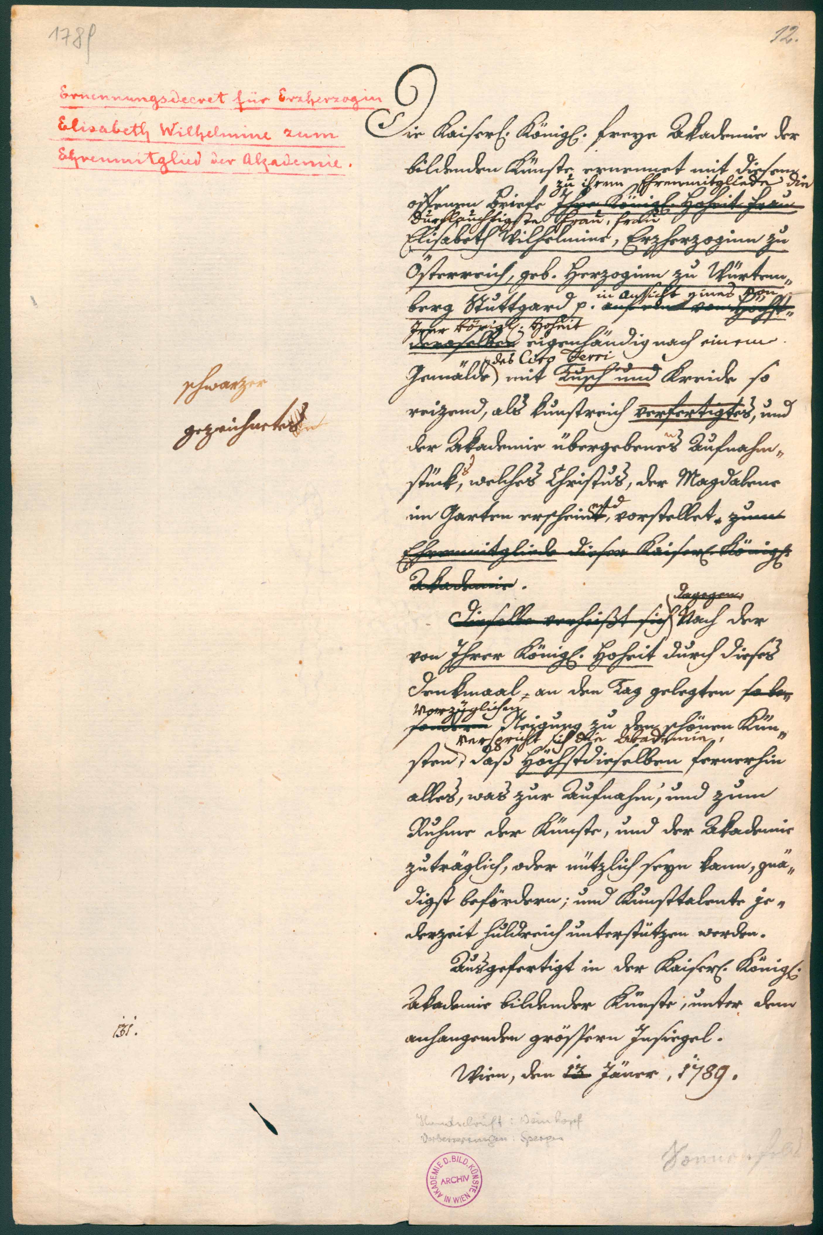 (31) Walter Wagner, Geschichte der Akademie der bildenden Künste Wien, Wien 1967, S. 432, nennt fälschlich 1785 als Aufnahmejahr; Grund dafür ist wohl, dass das Konzept für dieses Ehrenmitgliedsdiplom (datiert mit 13.1.1789) in einem Dokument mit Konzepten für verschiedene Diplome aus den Jahren 1785 bis 1789 enthalten und im Jahr 1785 abgelegt ist, UAAbKW, VA 1785, fol. 26–29, hier fol. 29v. Das Ernennungsdekret (UAAbkW, VA 1789, fol. 12) diente 1793 als Vorlage für das Dekret Erzherzogin Maria Anna Ferdinandas (UAAbKW, VA 1793, fol. 138).