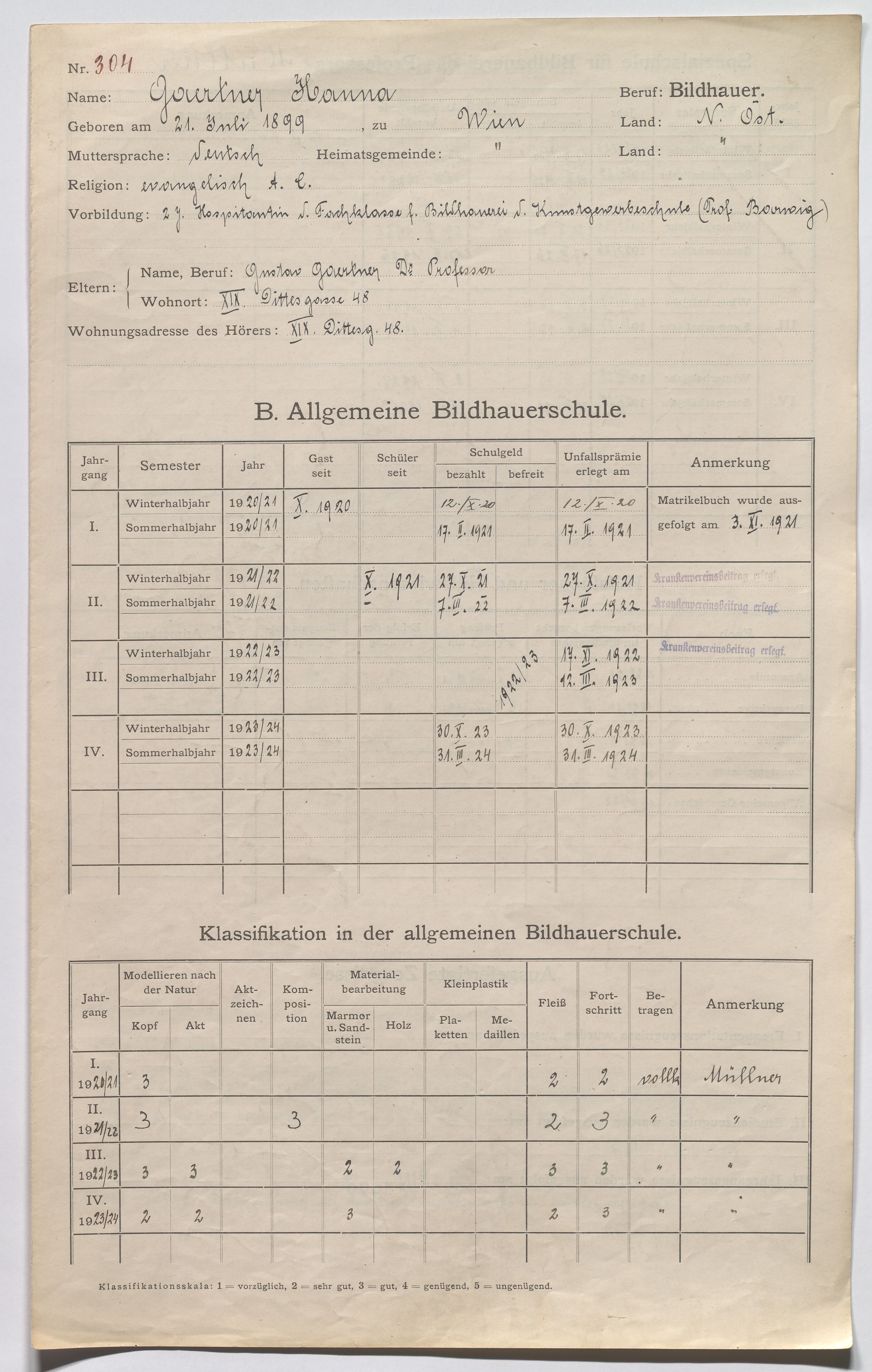 Eine der ersten Frauen jüdischer Abstammung war die Bildhauerin Hanna Gärtner (1899–1948). Aus einer Arztfamilie stammend (7) und als Kind getauft, begann sie ihre Ausbildung in diesem als sehr unweiblich angesehenen Kunstzweig (8) an der Kunstgewerbeschule bei Franz Barwig und Joseph Breitner. 1920 trat sie in die Allgemeine Bildhauerschule, im WS 1924/25 in die Spezialschule für Bildhauerei Josef Müllner an der Akademie der bildenden Künste ein.