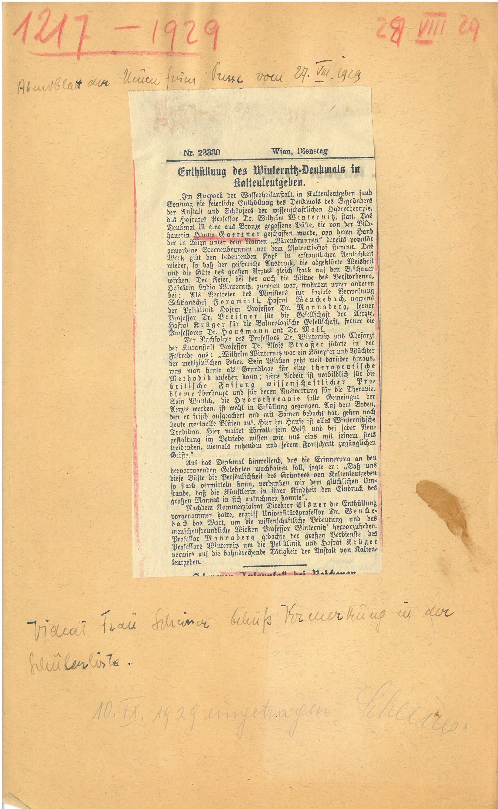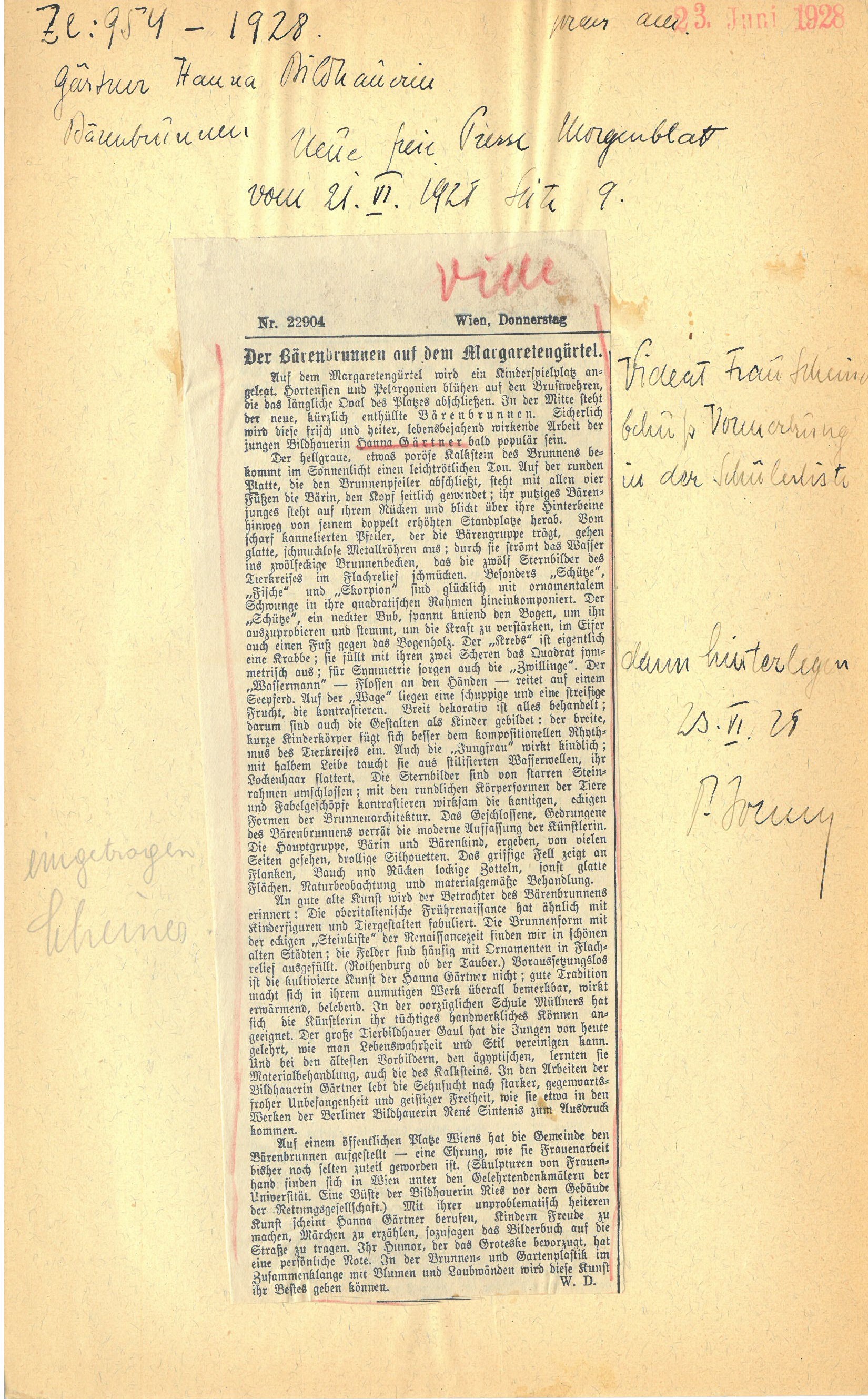 Hanna Gärtner gelang etwas, was Frauen meist verwehrt blieb (10) – ob ihre Verwandtschaft mit einer sehr prominenten Frau, der von Karl Kraus in seinen „Letzten Tagen der Menschheit“ massiv angegriffenen Kriegsberichterstatterin Alice Schalek (11) auf ihre Karriere Einfluss hatte, sei dahingestellt: Sie nahm an Ausstellungen teil, etwa des Künstlerhauses (12 ) (1926–1930) und des Verbandes bildender Künstlerinnen und Kunsthandwerkerinnen – dort z.B. 1930 mit einer Büste der Schauspielerin Hansi Niese (13) –, wurde 1929 Mitglied des Künstlerverbandes österreichischer Bildhauer, und es gelang ihr auch, Aufträge aus öffentlicher Hand zu lukrieren. Eine bekannte Arbeit ist das „erste plastische Werk von weiblicher Hand, das in Wien öffentlich aufgestellt wurde“ (14) : der Bärenbrunnen zwischen Julius-Popp-Hof und Herweghhof am Margaretengürtel in Wien. (15) Ein Zeitungsartikel, der im Universitätsarchiv bewahrt wird, erinnert an dieses Ereignis; ebenso fand Gärtners Winternitz-Denkmal in Kaltenleutgeben Niederschlag in den Medien.
