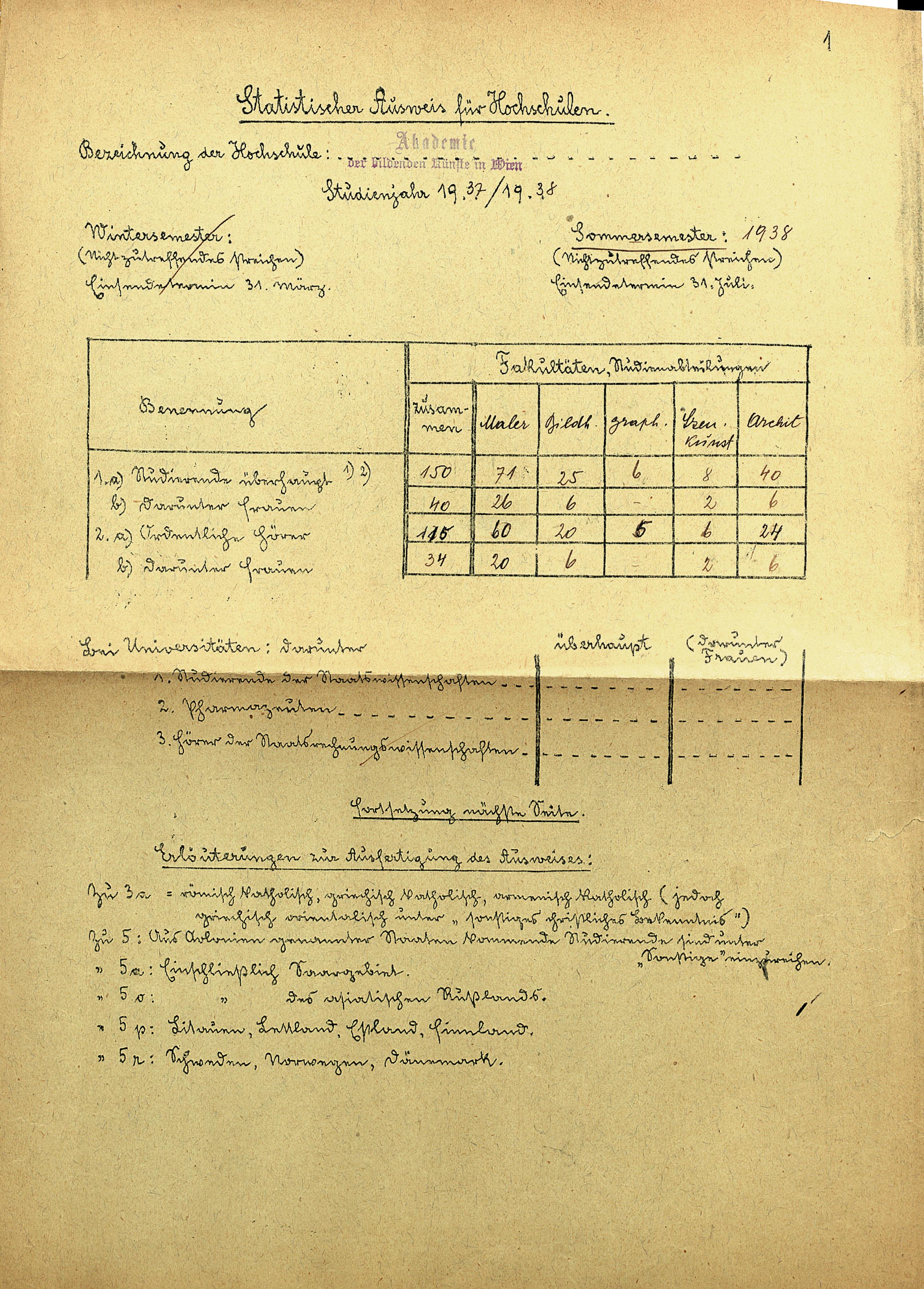 Diese Angabe deckt sich allerdings nicht mit der Zahl von allein sechs weiblichen jüdischen Studierenden, die sich mithilfe der Suche in der Datenbank zu Verena Pawlowskys Untersuchung zur Akademie der bildenden Künste im Nationalsozialismus (22) ergibt.