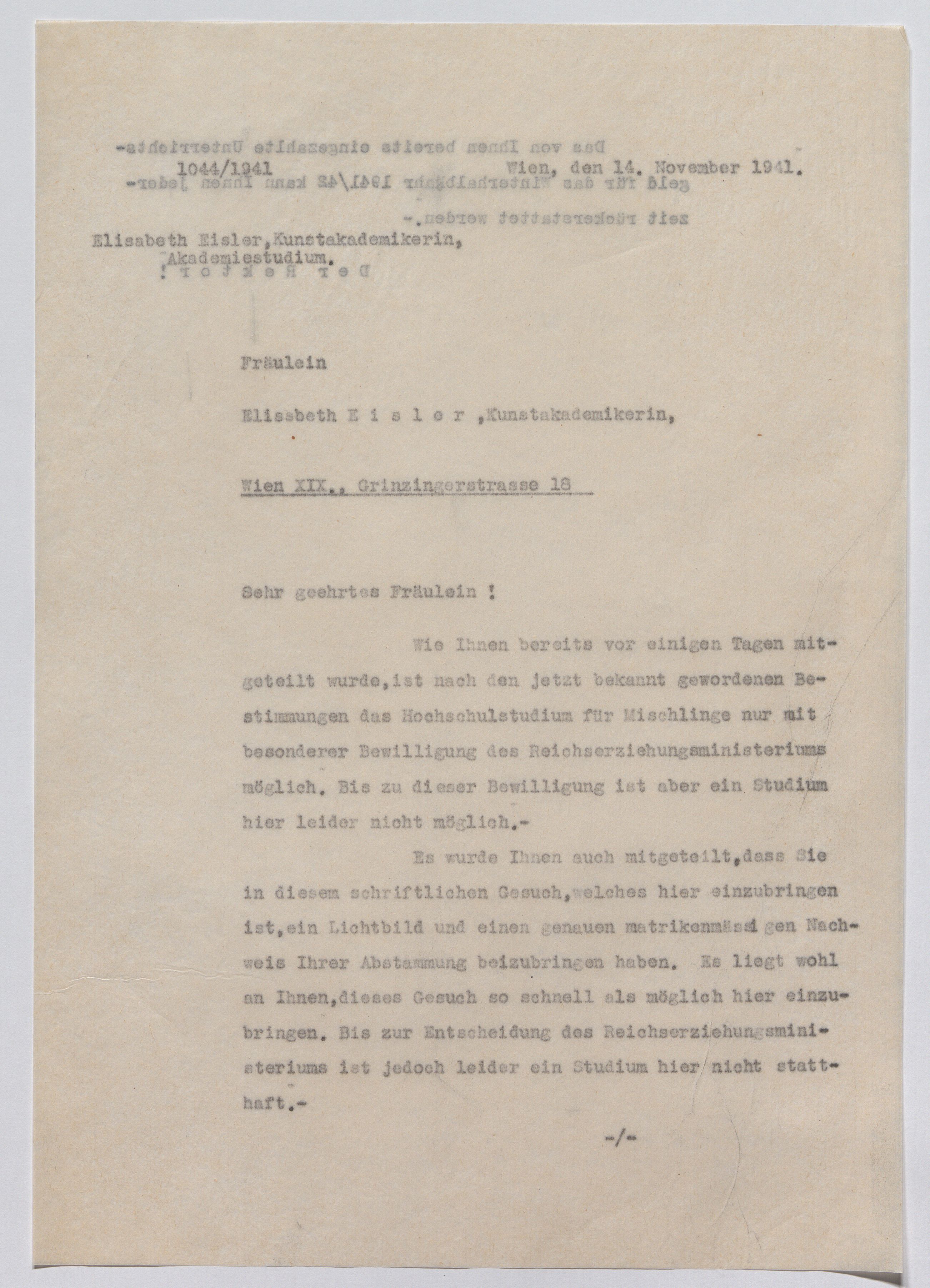 Elisabeth Eisler, geb. 15.5.1920 in Wien, ebenfalls aus dem gehobenen Bürgertum, studierte zuerst an der Wiener Frauenakademie und trat im WS 1941/42 in die Akademie, in die Allgemeine Malerschule unter der Leitung von Prof. Dimmel und Prof. Pauser, ein. Sie war römisch-katholisch getauft und galt als „Mischling 2. Grades“. Auf ihr Ansuchen um Bewilligung der Fortsetzung ihres Studiums erhielt sie folgende Antwort: „[...] Wie Ihnen bereits vor einigen Tagen mitgeteilt wurde, ist nach den jetzt bekannt gewordenen Bestimmungen das Hochschulstudium für Mischlinge nur mit besonderer Bewilligung des Reichserziehungsministeriums möglich. [...] Der Rektor.“ (23)