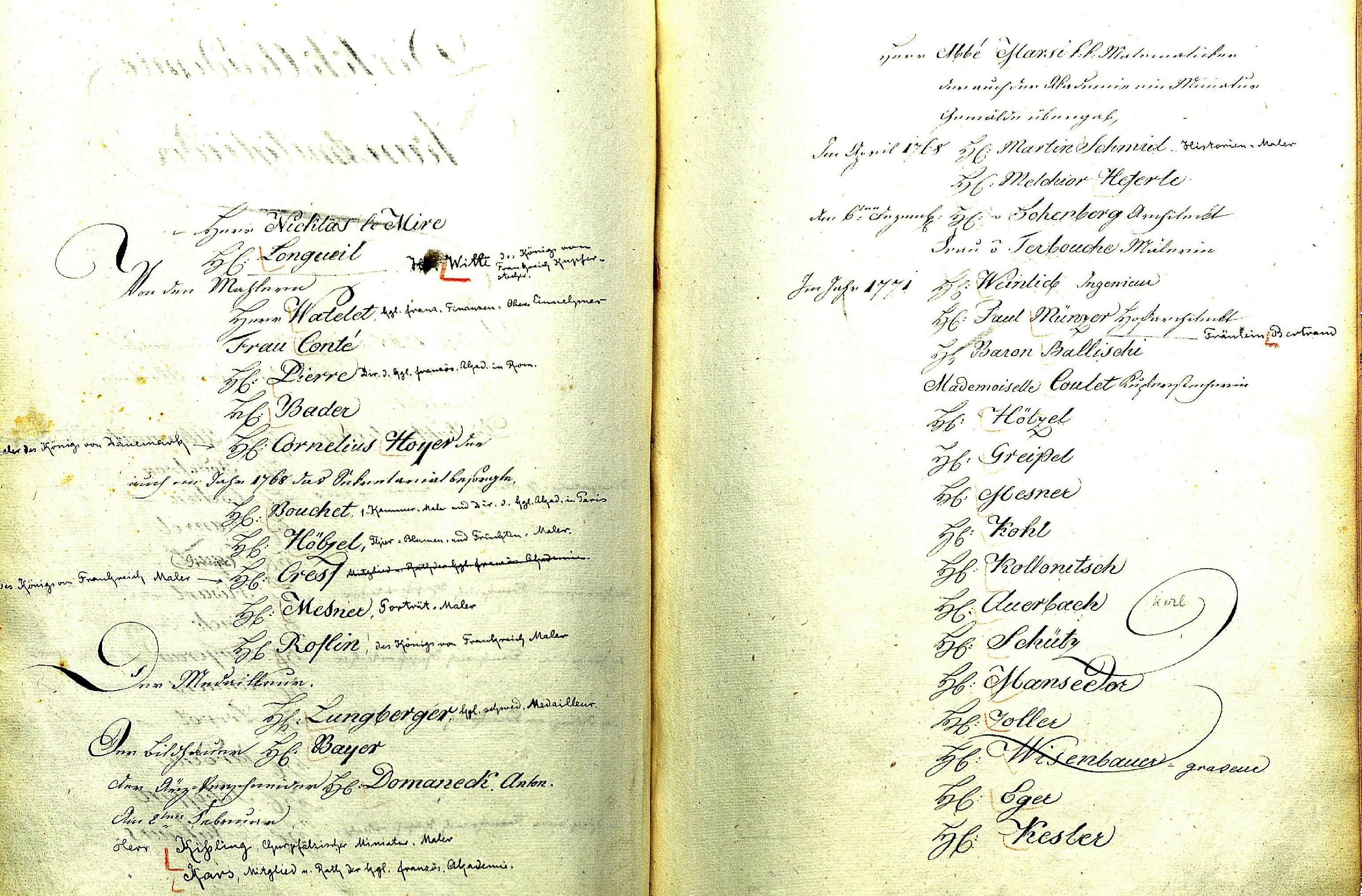 15 UAAbKW, VA 2a/Mappe 2, fol. 152/153 ex 1771; UAAbKW VA 1818 fol. 69–81, hier fol. 73v. Das Wahlbuch (S. 120) führt für 1771 „Mademoiselle Coulet“ an; „Fräulein Bertrand“ ist hier in späterer Handschrift ergänzt, und es ist anzunehmen, dass es sich bei „Baron Ballischi“ um eine verballhornte Baronesse Pélichy handelt. Vgl. zum Folgenden: Monika Knofler: Das fortschrittliche 18. Jahrhundert – Maria Theresias Vorbildfunktion für Künstlerinnen, in: Carte blanche für Anna Reisenbichler. I work too much, work too little. Hg. v. Wolfgang Cortjaens und Julia M. Nauhaus. Kupferstichkabinett der Akademie der bildenden Künste Wien, Wien 2019, S. 17–34; Anton Weinkopf’s Beschreibung der k.k. Akademie der bildenden Künste in Wien. 1783 und 1790, Wien 1875, S. 11.