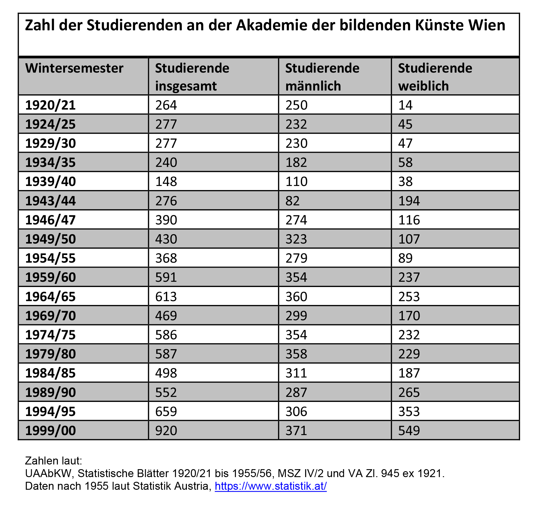Wie geht es dann weiter? Die Statistiken zeigen, dass die Zahl der an der Akademie inskribierten Frauen nur allmählich anstieg. Standen im Wintersemester 1920/21 noch 14 Frauen 250 Männern gegenüber, waren es 1929/30 schon 47 gegenüber 277 Männern. 1969/70 sind immer noch etwa halb so viele Frauen wie Männer inskribiert, 1999/2000 sind dann deutlich mehr Frauen als Männer unter den Studierenden. (13)