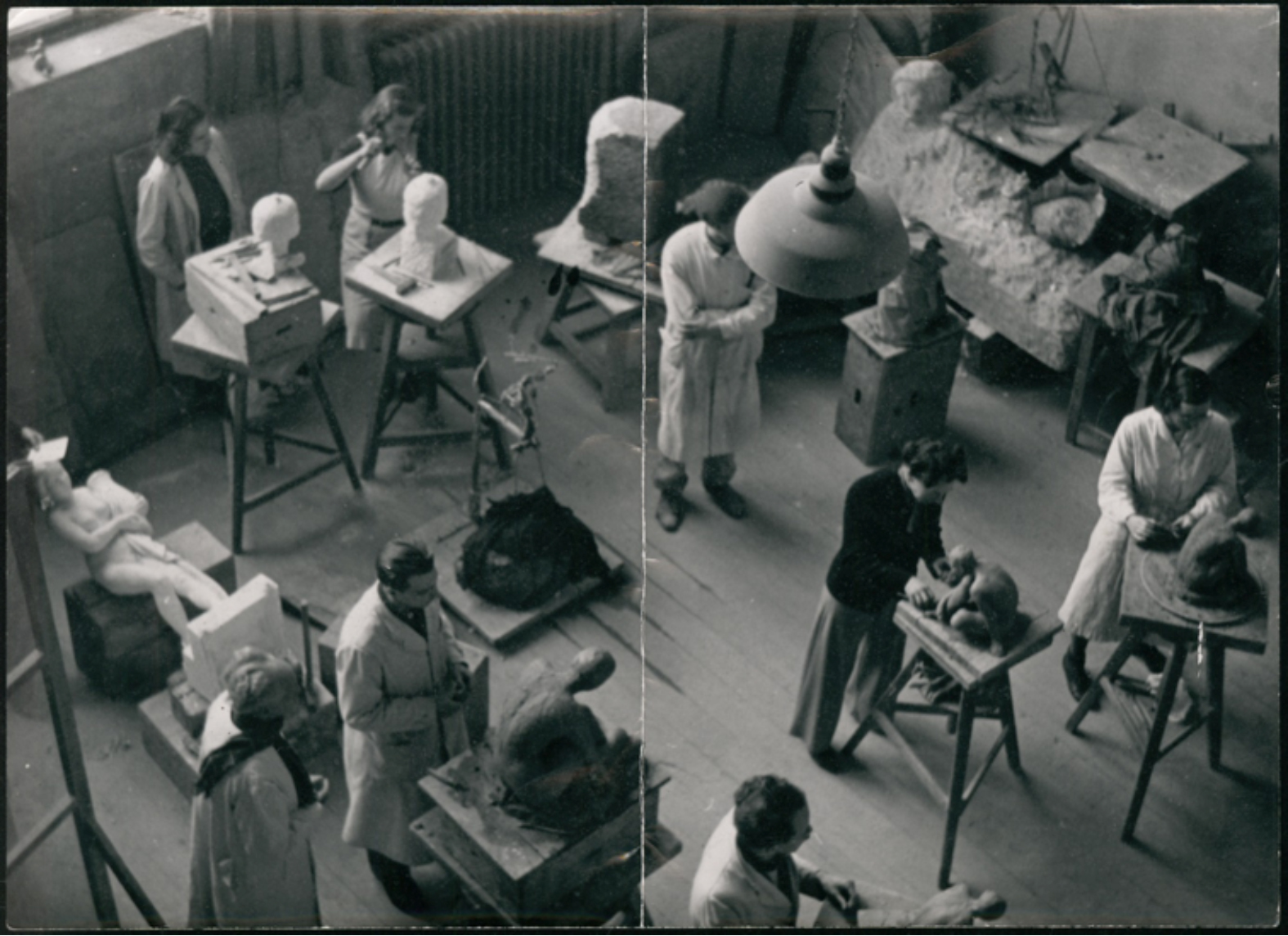 Ein zweites Foto(2), ein Schwarzweißabzug, zeigt einen Blick von oben auf Studierende – vier Frauen und ein Mann – vor ihren Skulpturen im Atelier. Professor Müllner und ein Assistent begutachten die Arbeiten. Die Verhältnisse sind beengt, möglicherweise handelt es sich um eine gestellte Aufnahme. Auch dieses Foto ist undatiert.