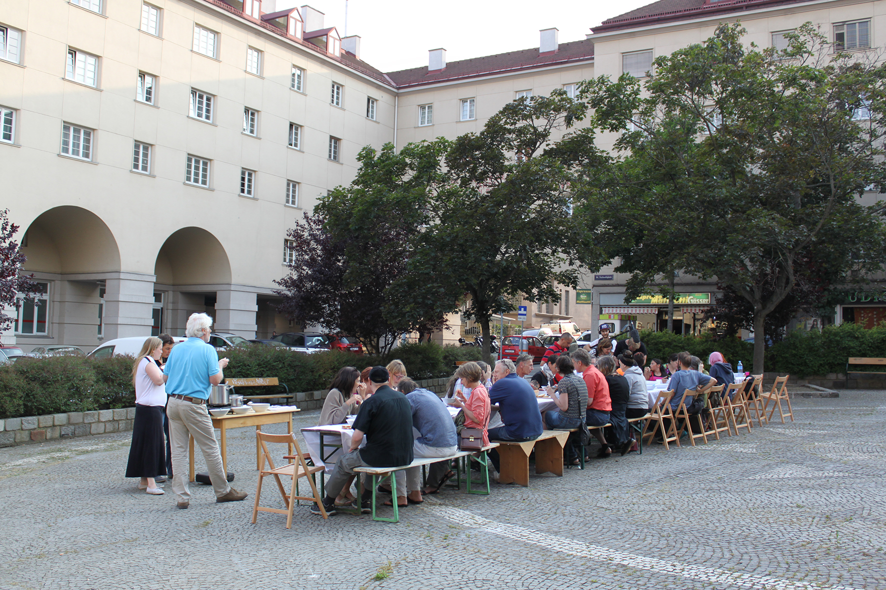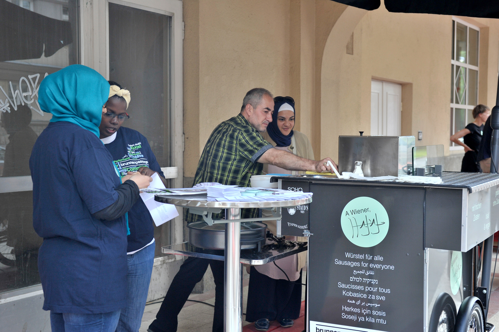 Eine künstlerische Intervention, die (Essens-)traditionen verbindet und für das Recht auf Arbeit für Geflüchtete eintritt. Die am Entstehungsprozess beteiligten neuen Stadtbüger_innen übernehmen den Verkauf der Wurstwaren als Zuverdienst.