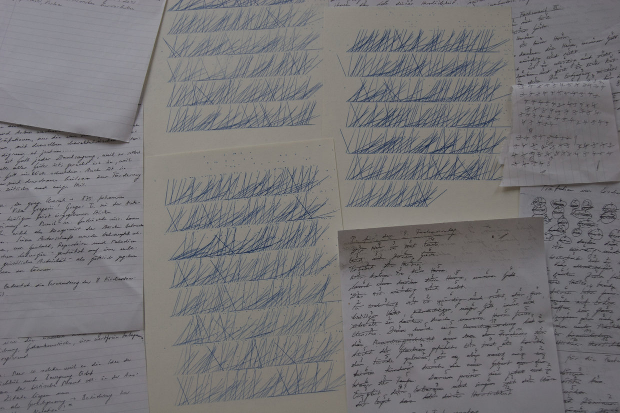 Papst Gregor I. schreibt über ein Buch gebeugt. Er schreibt, was ihm die Taube auf seiner Schulter ins Ohr flüstert. Seine Kopisten schreiben ab, was er geschrieben hat. Aus dem Thema der Darstellung der Gregorplatte geht eine Schreibübung des Künstlers hervor: Gebeugt über ein Blatt Papier, anstelle verknüpfter Schlaufen das Ziehen von Linien dem Lineal entlang, das Abschreiben und das Aneinanderreihen von Vorwörtern mittels Abzählen der Wortlängen, während die Sommertage entlang der Sonntage im Jahreskreis verstreichen. Als Gewebe legen sich die Gebete unter dem Durchschreibepapier nieder, folgen der Richtung der Zeilen, formen ein Kapitel.