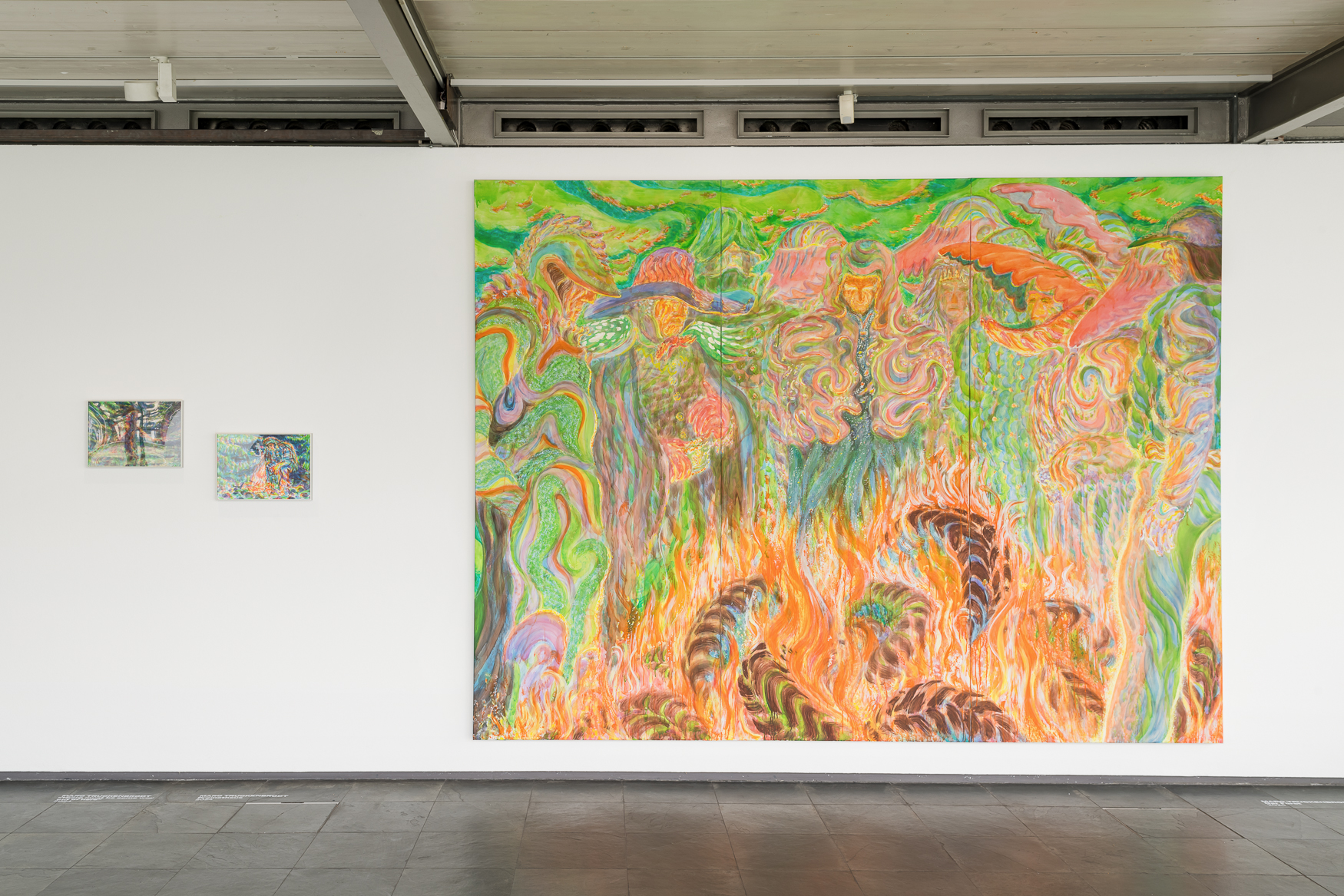 großes buntes Gemälde an einer Wand, zwei kleine bilder hägen daneben