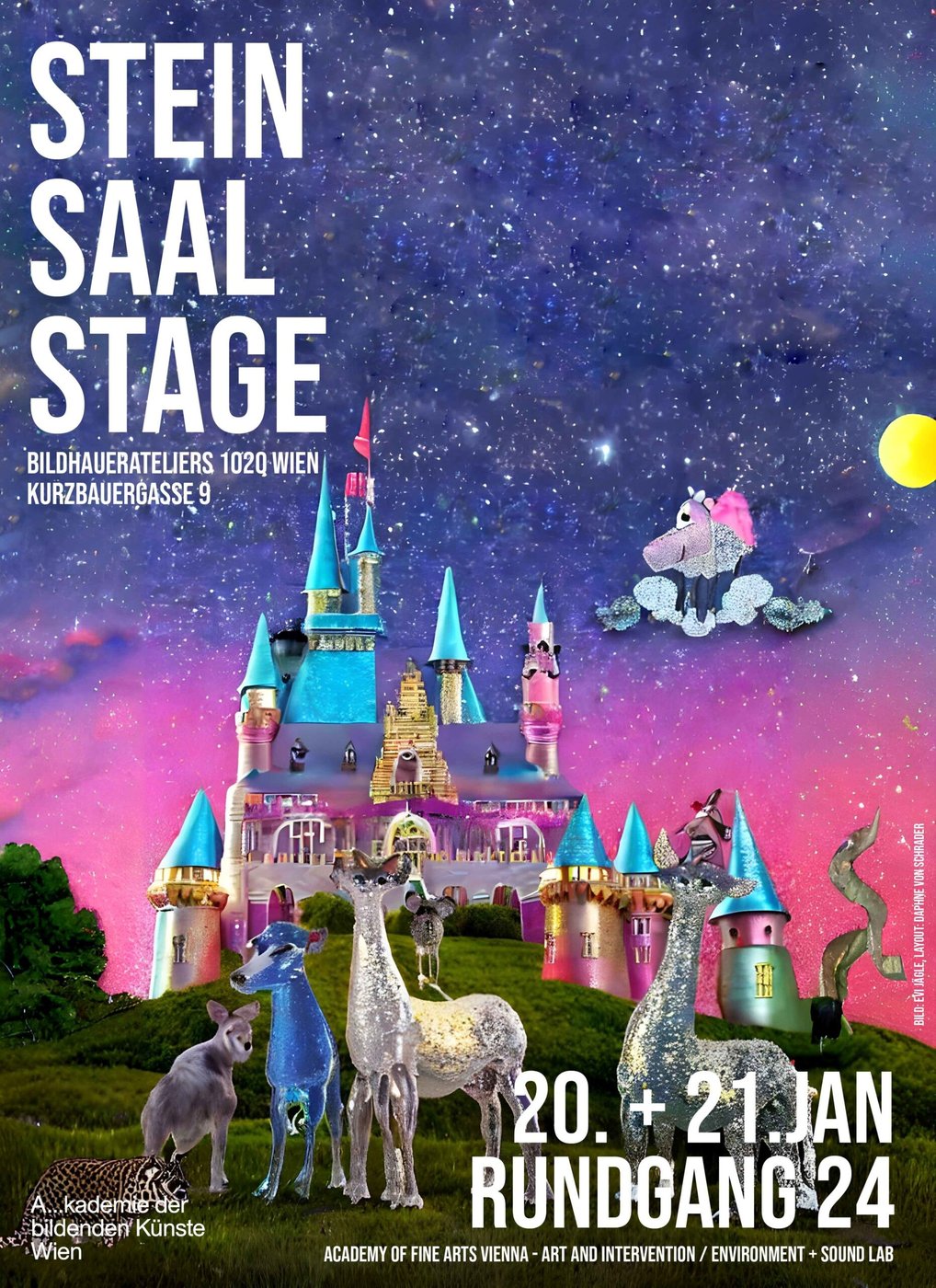 Der Fachbereich Kunst und Intervention | Umfeld und das Soundlabor hosten eine Bühne im Großen Steinsaal der Bildhauereiateliers und freuen sich ein diverses Programm verschiedener Künstler_innen und Kunstsparten anzukündigen! Darunter: Konzerte, Performances, Experimentelle Sound Art, Elektronische Musik, DJs, Lesungen etc.